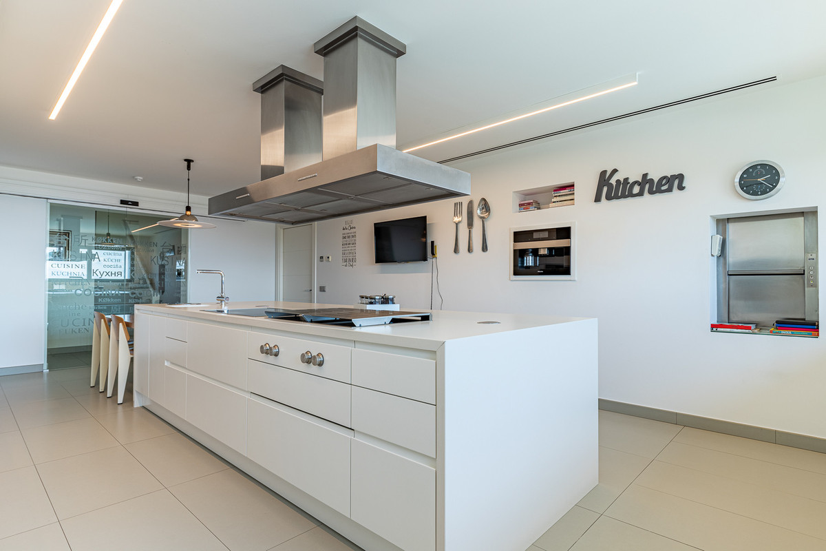The ground level of the villa with access to the garden consists of games and barbecue area that features a dumbwaiter connecting directly to the kitchen. The upper level with access to the pool area comprises wine cellar, fully-equipped gym, jacuzzi, sauna, Turkish bath, and a dressing room. The first floor welcomes you into a spectacular living room offering breathtaking panoramic sea views, dining area and state-of-the-art kitchen with an island. Furthermore, on this level are 4 en-suite bedrooms, laundry room and service apartment with two bedrooms, lounge and a bathroom. The second floor houses an office room with access to the solarium and en-suite master bedroom that includes walk-in closet and opens onto a vast terrace.