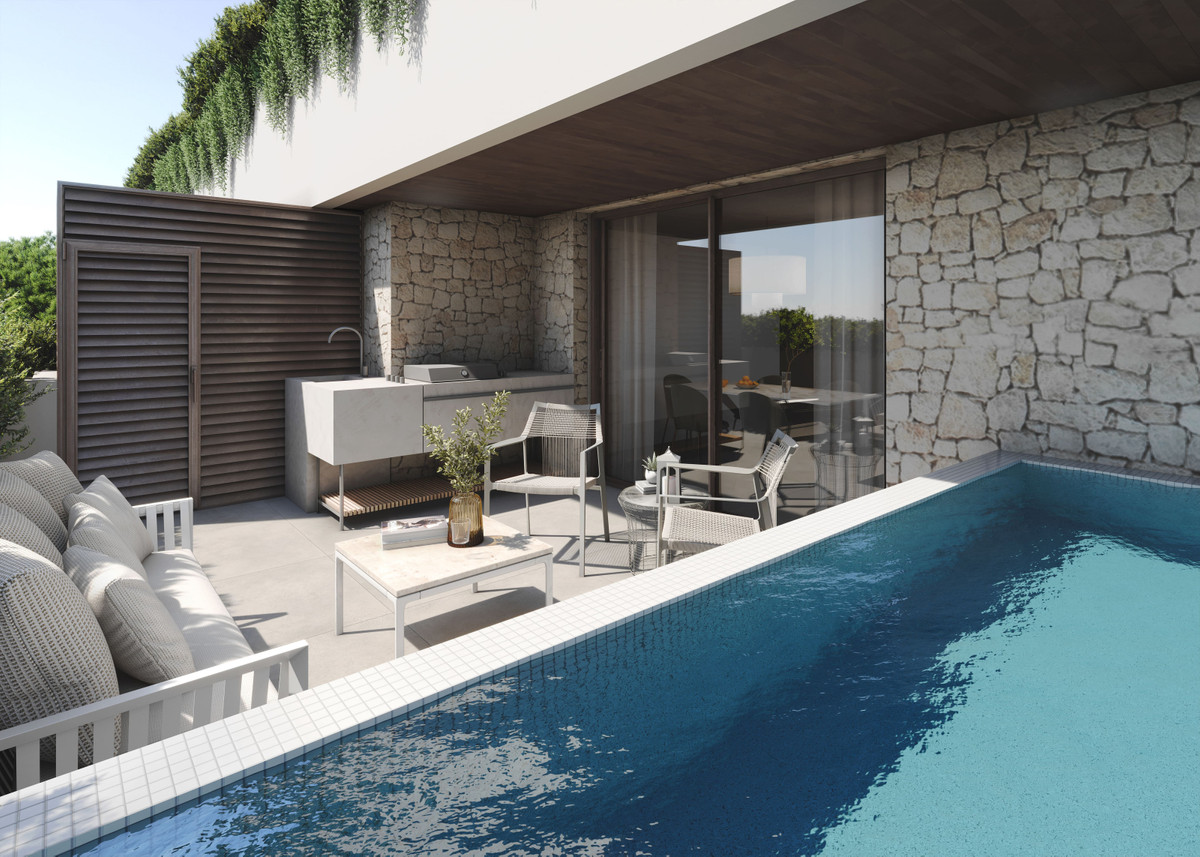Hvor du kan nyde din egen pool og grill uforstyrret. Desuden gør haven, der omgiver boligen, alle terrasser 100% private, hvilket sikrer dit privatliv og sikkerhed.