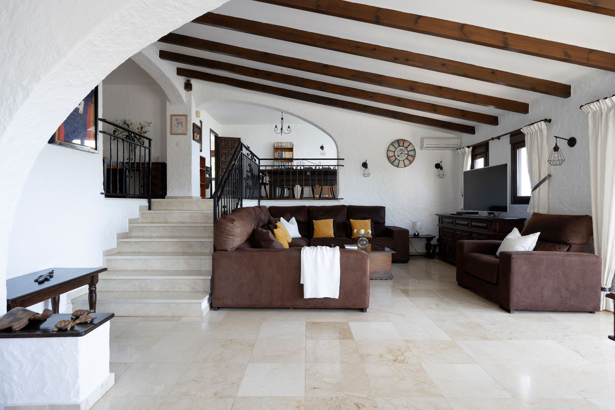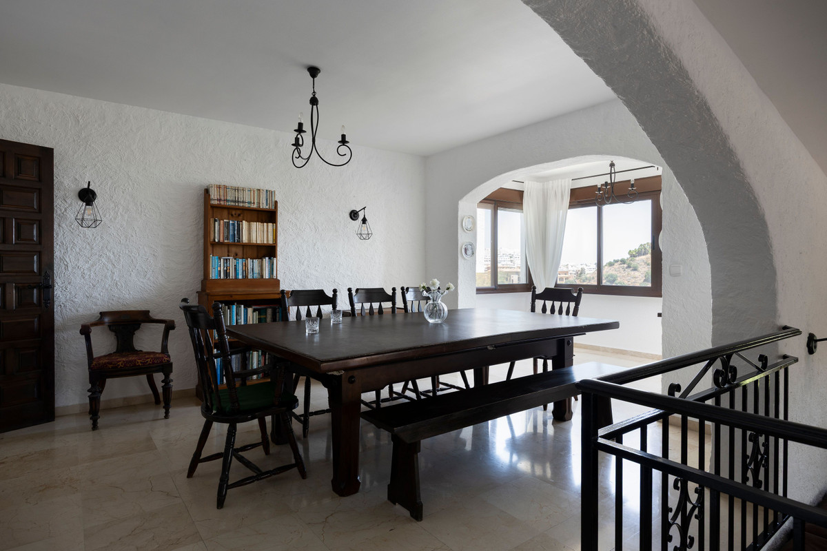 The villa welcomes you with classic Andalusian architecture and warm, open spaces designed for both relaxed living and elegant entertaining. Inside, you'll find marfil marble floors that flow throughout the main level, enhancing the sense of luxury and natural light. The impressive open-plan living and dining room is framed by large picture windows and direct access to sunny terraces, ideal for enjoying the spectacular vistas and indoor-outdoor lifestyle.