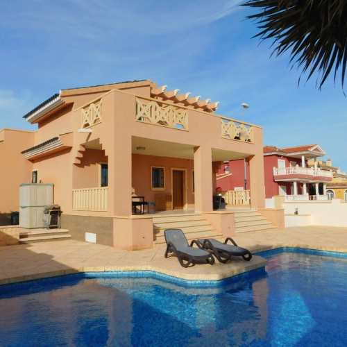Here we have this amazing Luz style detached villa with stunning views to the La Marquesa Golf course and surrounding area. The main villa consists of 3 double bedrooms  with 3 bathrooms 2 being ensuite. Huge lounge with separate dining room and Kitchen with utility room. There are 3 main terraces from the main house 2 being open and one enclosed very bright with doors and windows that can be opened up giving the feel of one huge terrace again with stunning views towards pool and golf. Thee  underneath could be converted into a large under build with 3m high ceilings so lots of potential.. on the outside there is again plenty of terraced areas and a large 12x5 heated pool, There is a separate 2 bed 2 bath self contained bungalow that over looks the pool. Complete with many extras air-con, underfloor heating , electric gates.........