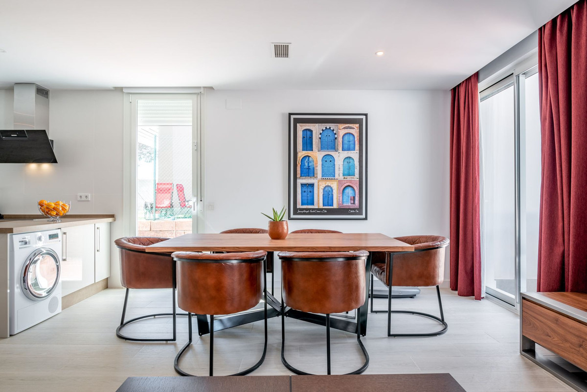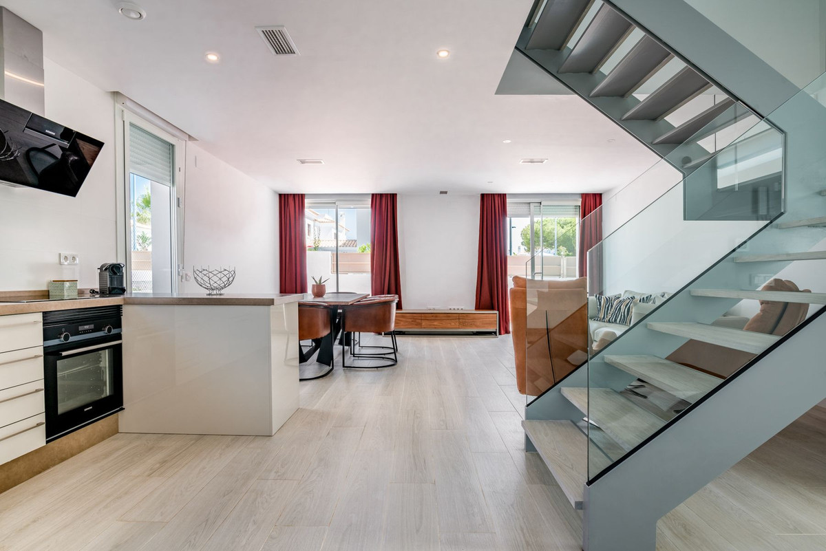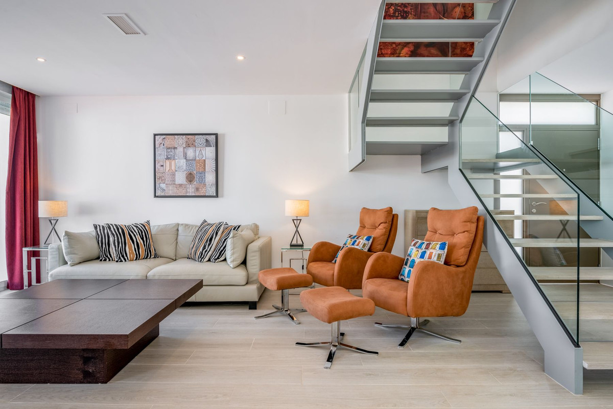 The open plan layout features a contemporary, fully equipped kitchen seamlessly connecting to the living and dining areas. This bright and airy space benefits from full air conditioning, double glazing, and fibre optic internet, ensuring comfort and modern conveniences throughout. The living area effortlessly extends onto a private terrace, offering direct access to a heated outdoor pool surrounded by an inviting private garden. This outdoor haven includes an al fresco dining and chill-out area, as well as a barbecue zone—ideal for entertaining or simply enjoying the region's exceptional climate.