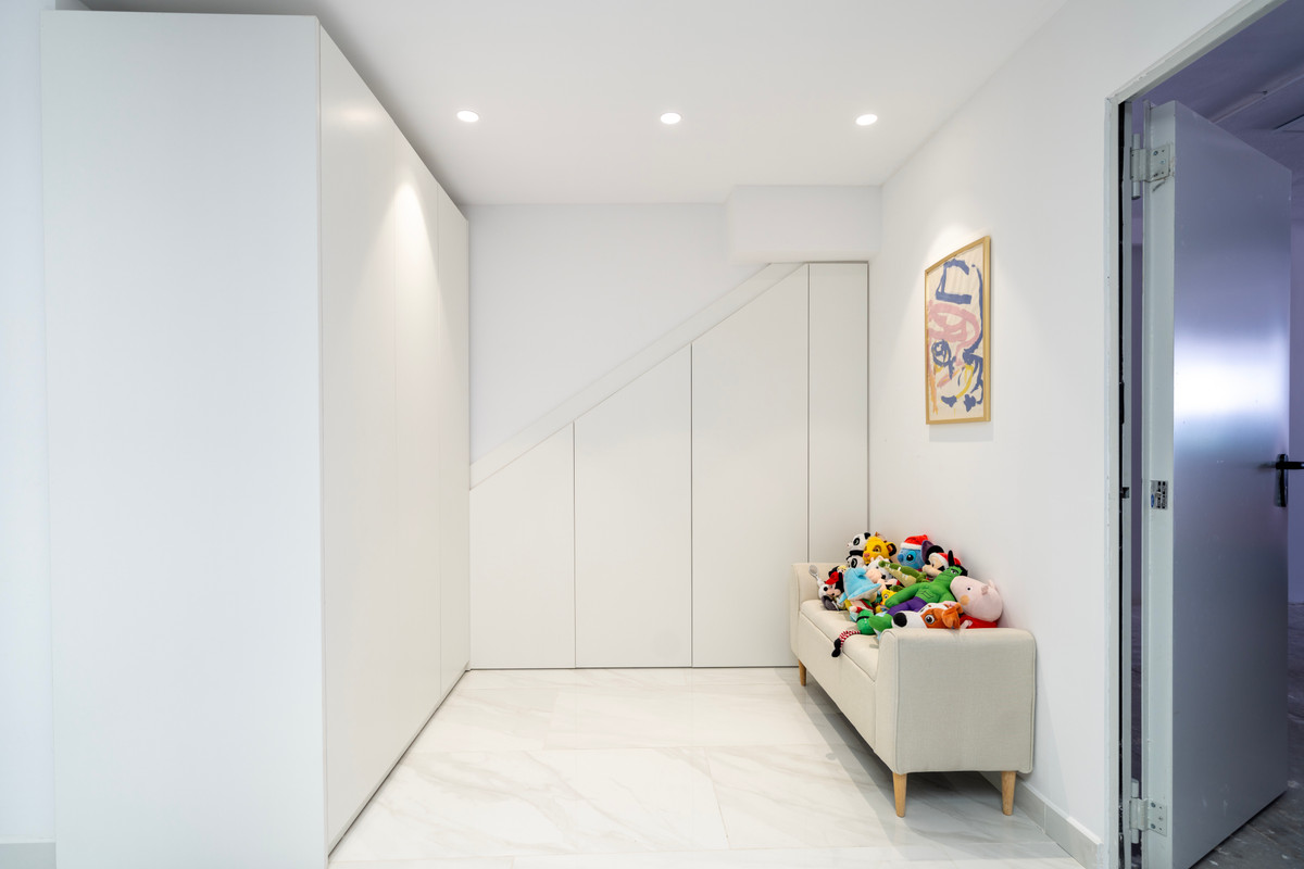 On the main floor (98m2 built), access is through a charming private patio that leads into a hallway. To the right you`ll find, the fully equipped open-plan kitchen with a central island, a custom-designed dining area, and a spacious, bright living room with direct access to a sunny terrace — ideal for outdoor breakfasts or evening meals. To the left, there is a modern staircase with stylish, futuristic lighting that leads to the lower floors, as well as a guest toilet.