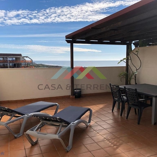 We present this home for sale, located just 170 meters from Morche Beach, in a very quiet building built in 2001 with only thirty residents. It features a communal pool. The home is located on the third and penultimate floor of the building. The living room and kitchen face east, and the two bedrooms face west. This property is bright and well-ventilated as it is exterior. Upon entering, we find the living room and open-plan kitchen, both with access to an eight-meter terrace overlooking the pool. It has a large bathroom, an interior room used as a wardrobe or sitting area, and two bedrooms: one double with a built-in wardrobe and the other single bedroom with access to another four-meter terrace with panoramic views. An underground parking space is included, the building has an elevator, and a communal roof terrace for use as a clothesline. The home has only had one owner and is in perfect condition, requiring no renovations. It features marble floors, sapelli-style interior woodwork, and white lacquered aluminum exterior woodwork. It is sold furnished.