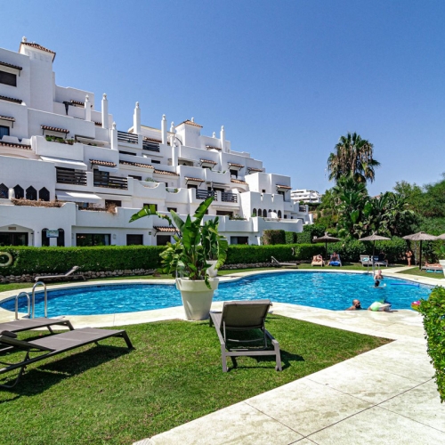 Situated on the first floor, this fully furnished apartment features an elegant living room that opens to a terrace, offering lovely views of the pool area and garden. It includes a modern, fully equipped kitchen, two double bedrooms with en suite bathrooms, fitted wardrobes, and balconies. Additional amenities include a laundry area, a parking space in the underground car park and a storage room.