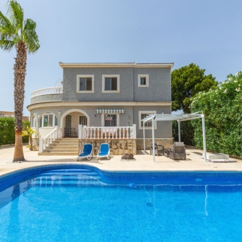 We present this impressive detached villa set on a 885 m² private plot, located in a peaceful residential area of San Fulgencio. The property features 5 bedrooms and 5 bathrooms, including one located outside — perfect as a pool bathroom or for guest use — making it ideal for large families or as a spacious holiday home.