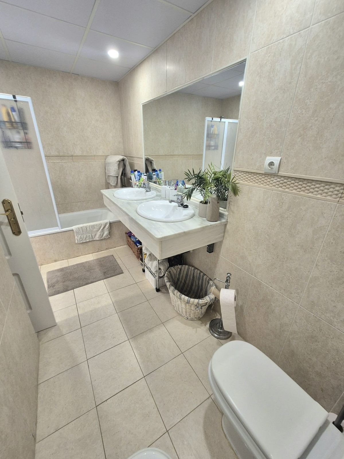 Entering the penthouse into the hallway you have to the right the master bedroom with en suite bathroom with a bath / shower combi and double sinks, fitted wardrobes and access to one of the three large terraces the penthouse has to offer. Next to here you have the bright corner living room with two large french patio doors where you have 2 large terraces south facing with amazing golf and mountain views. You have the fully fitted kitchen to the left of the hallway and stairs going up to the second level, where you will find 2 bedrooms, large wardrobes, full bathroom, and solarium with breathtaking views. A fantastic chill out area to enjoy the evenings.