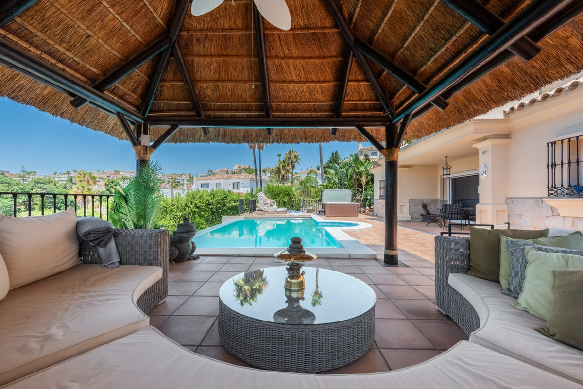 Udenfor byder en solfyldt terrasse med udsigt over golfbanen på en opvarmet infinity pool med saltvand som hjertet i en afslappet middelhavsstil. Et jacuzzi og et skyggefuldt pavillon skaber det perfekte miljø til udendørs bespisning, afslapning eller gæstemodtagelse med betagende udsigt.