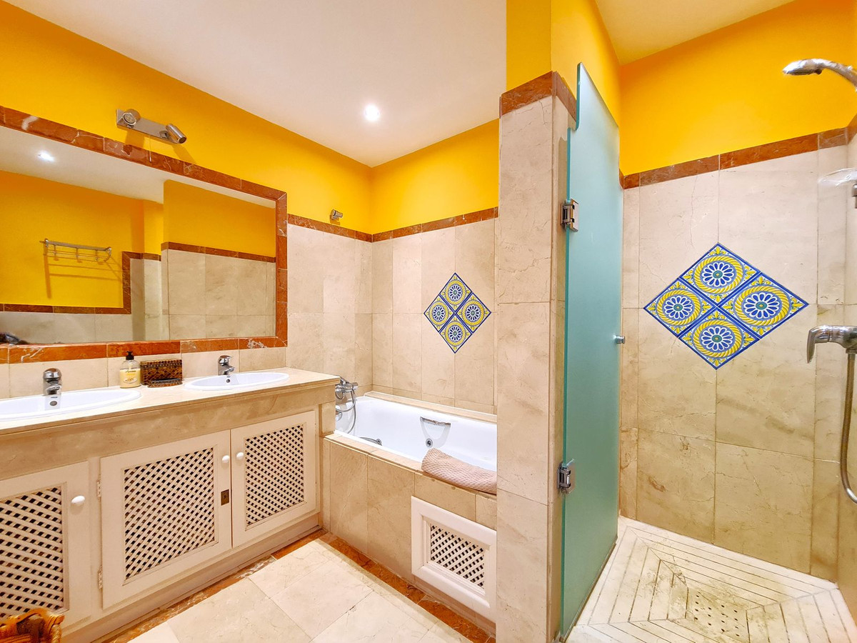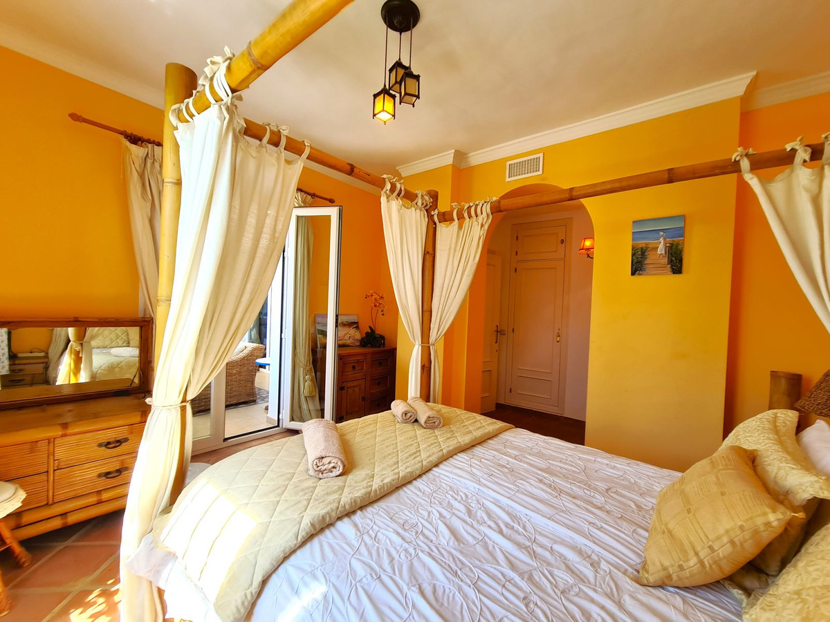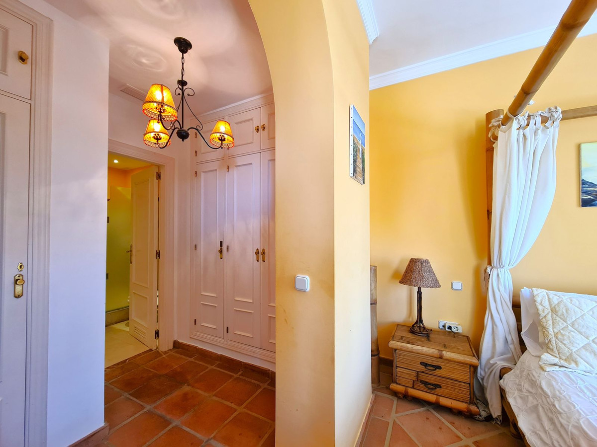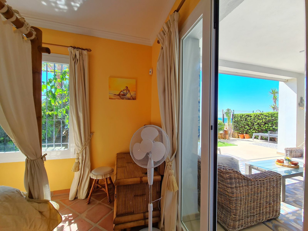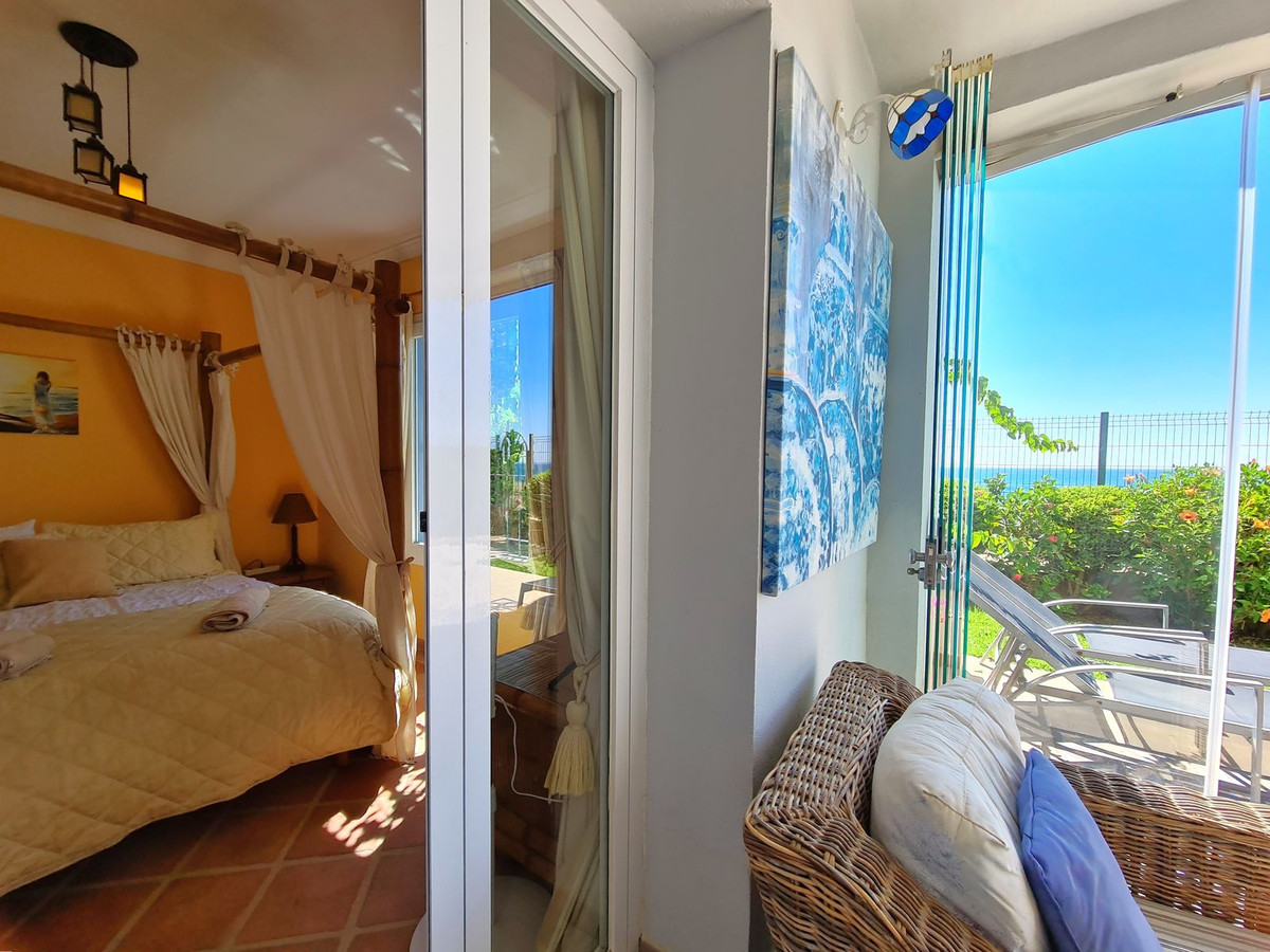 Med en fremragende beliggenhed ved stranden med direkte adgang til kyststien og Casares-stranden, kun få minutter fra Finca Cortesín Golfbane, en af de mest prestigefyldte golfbaner i Spanien, hvor den har været vært for adskillige højprofilerede begivenheder, herunder Volvo World Match Play Championship tre gange og Solheim Cup i 2023. Kun 10 minutter i bil fra Estepona og 4 minutter fra San Luis de Sabinillas med dens smukke og maleriske Puerto de La Duquesa. Tæt på supermarkeder, skoler og det nye Estepona Hospital. Denne STORE LEJLIGHED I STUEETAGE MED PRIVAT HAVE OG HAVUDSIGT har DIREKTE ADGANG TIL STRANDEN og er sydvendt. Ejendommen kan prale af en rummelig entré, der fører til den rummelige stue-spisestue med store vinduer, der er forbundet med den store overdækkede terrasse, som har glasgardiner og også giver rigeligt naturligt lys og en smuk udsigt over havet og haven indefra huset. Derudover er det åbne køkken fuldt udstyret og har et vaskerum. Disse fællesområder har et gæstetoilet placeret ved siden af husets indgang. Husets tre soveværelser er fordelt ud fra stuen. De to gæsteværelser kan prale af store indbyggede skabe og store vinduer med udsigt over de smukke fælleshaver. Ved siden af dem er der et komplet badeværelse med badekar og gulvvarme. Det rummelige soveværelse har et påklædningsområde og et eget badeværelse med spabad, separat bruser, dobbelt håndvask og gulvvarme. Dette soveværelse har også direkte adgang til den private terrasse. Hjemmet kan prale af smukke og velholdte fællesområder med flere swimmingpools og ideelle haver. EN STOR MULIGHED FOR AT OPLEVE LUKSUSEN VED AT HAVE DIT HJEM VED MIDDELHAVETS KYSTER!!
