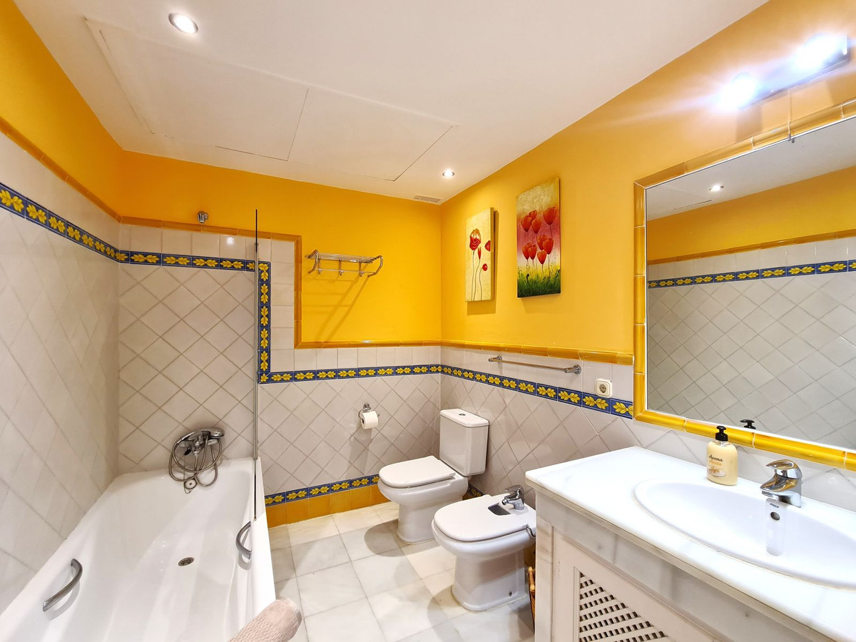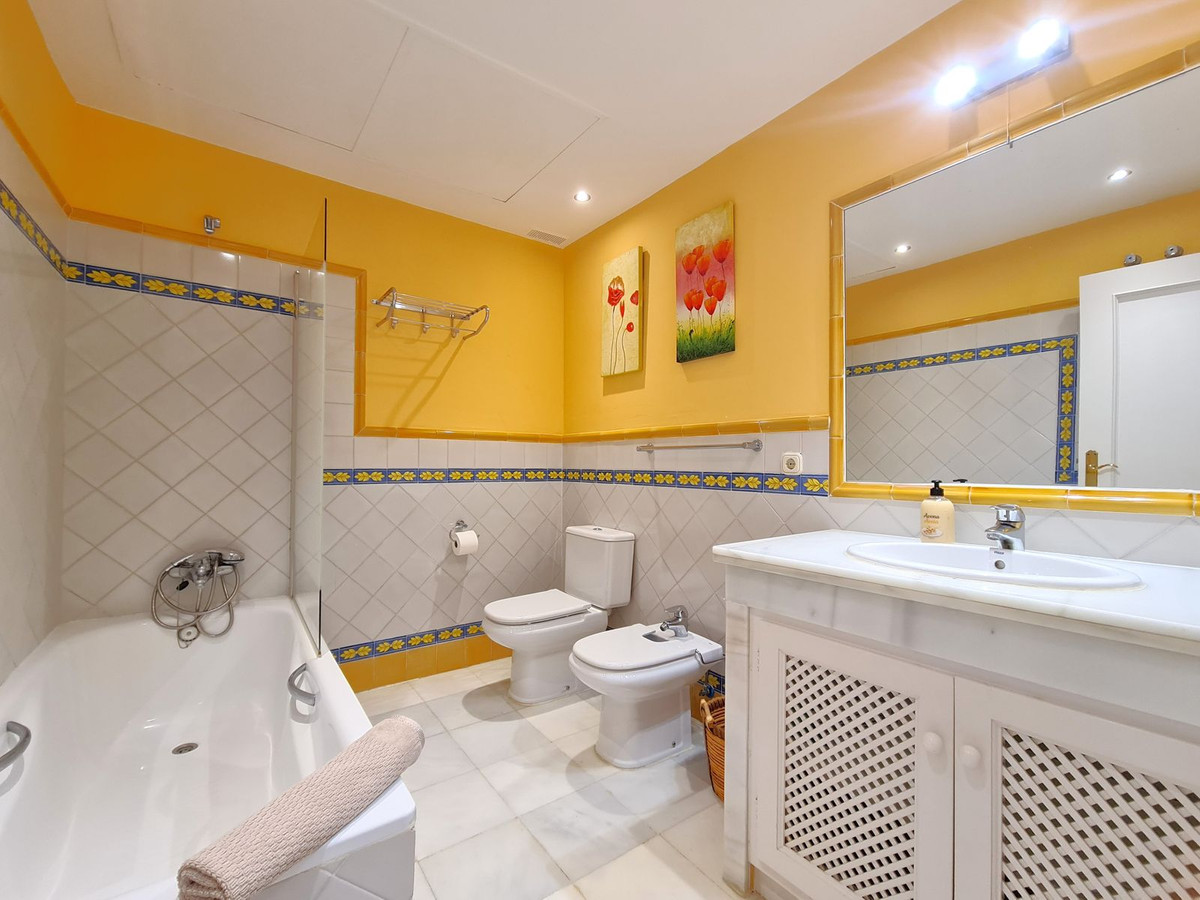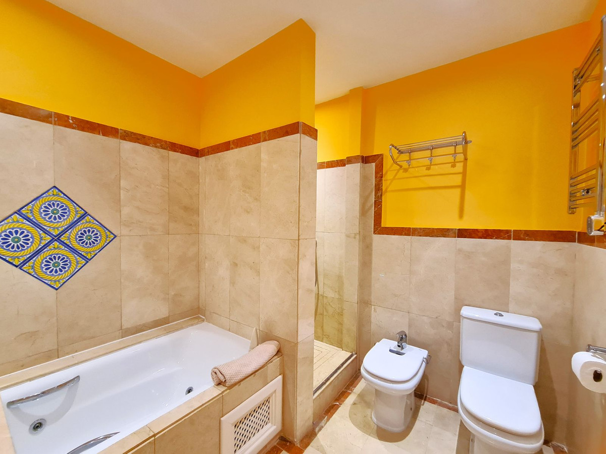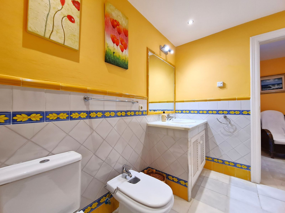 Med en fremragende beliggenhed ved stranden med direkte adgang til kyststien og Casares-stranden, kun få minutter fra Finca Cortesín Golfbane, en af de mest prestigefyldte golfbaner i Spanien, hvor den har været vært for adskillige højprofilerede begivenheder, herunder Volvo World Match Play Championship tre gange og Solheim Cup i 2023. Kun 10 minutter i bil fra Estepona og 4 minutter fra San Luis de Sabinillas med dens smukke og maleriske Puerto de La Duquesa. Tæt på supermarkeder, skoler og det nye Estepona Hospital. Denne STORE LEJLIGHED I STUEETAGE MED PRIVAT HAVE OG HAVUDSIGT har DIREKTE ADGANG TIL STRANDEN og er sydvendt. Ejendommen kan prale af en rummelig entré, der fører til den rummelige stue-spisestue med store vinduer, der er forbundet med den store overdækkede terrasse, som har glasgardiner og også giver rigeligt naturligt lys og en smuk udsigt over havet og haven indefra huset. Derudover er det åbne køkken fuldt udstyret og har et vaskerum. Disse fællesområder har et gæstetoilet placeret ved siden af husets indgang. Husets tre soveværelser er fordelt ud fra stuen. De to gæsteværelser kan prale af store indbyggede skabe og store vinduer med udsigt over de smukke fælleshaver. Ved siden af dem er der et komplet badeværelse med badekar og gulvvarme. Det rummelige soveværelse har et påklædningsområde og et eget badeværelse med spabad, separat bruser, dobbelt håndvask og gulvvarme. Dette soveværelse har også direkte adgang til den private terrasse. Hjemmet kan prale af smukke og velholdte fællesområder med flere swimmingpools og ideelle haver. EN STOR MULIGHED FOR AT OPLEVE LUKSUSEN VED AT HAVE DIT HJEM VED MIDDELHAVETS KYSTER!!