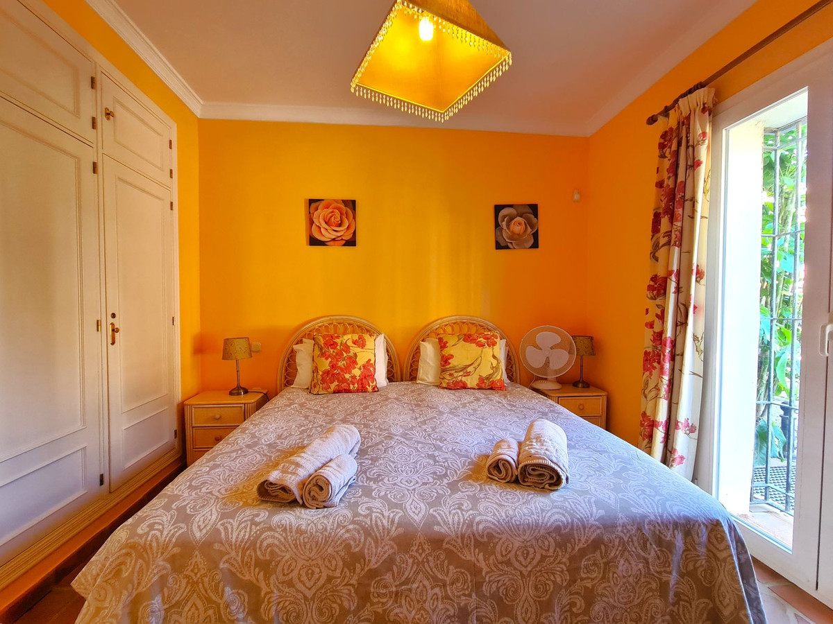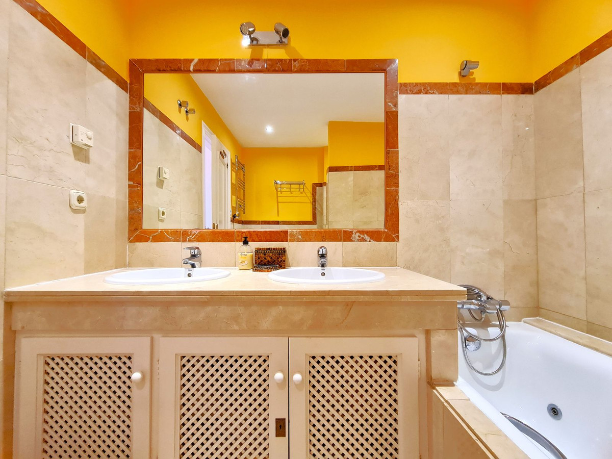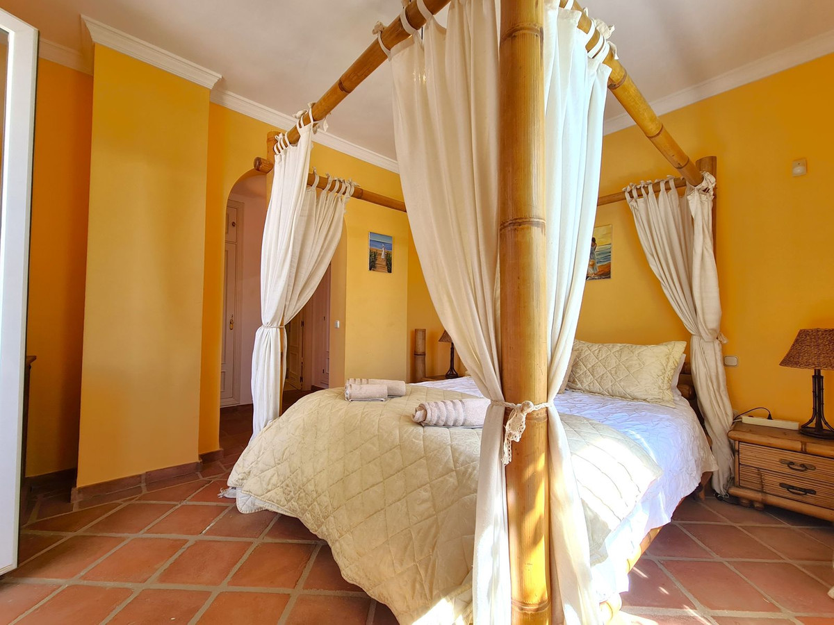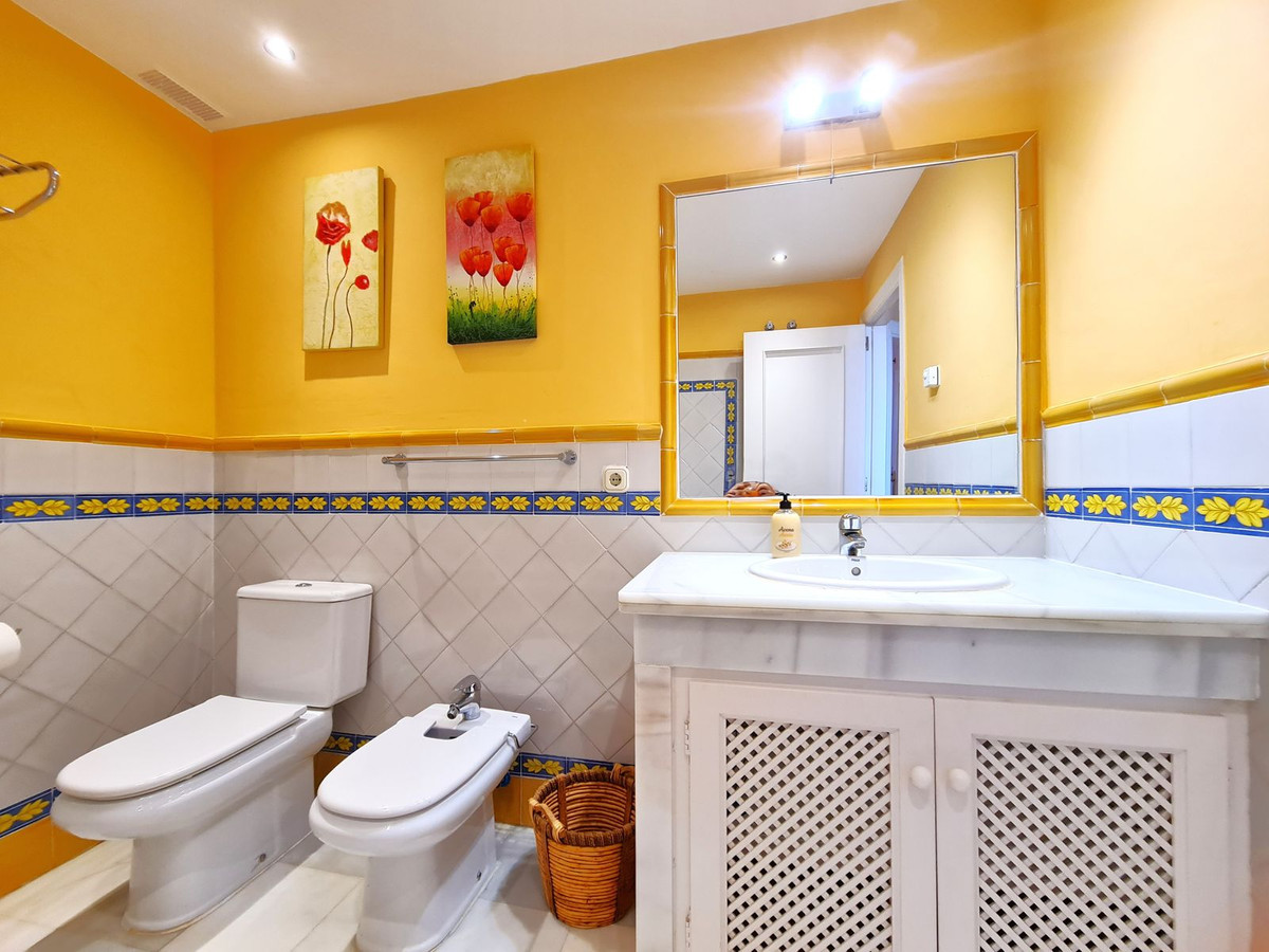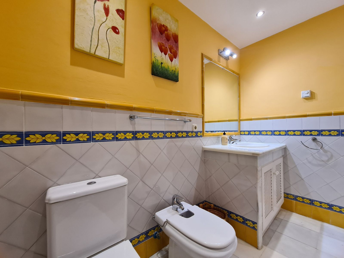 Med en fremragende beliggenhed ved stranden med direkte adgang til kyststien og Casares-stranden, kun få minutter fra Finca Cortesín Golfbane, en af de mest prestigefyldte golfbaner i Spanien, hvor den har været vært for adskillige højprofilerede begivenheder, herunder Volvo World Match Play Championship tre gange og Solheim Cup i 2023. Kun 10 minutter i bil fra Estepona og 4 minutter fra San Luis de Sabinillas med dens smukke og maleriske Puerto de La Duquesa. Tæt på supermarkeder, skoler og det nye Estepona Hospital. Denne STORE LEJLIGHED I STUEETAGE MED PRIVAT HAVE OG HAVUDSIGT har DIREKTE ADGANG TIL STRANDEN og er sydvendt. Ejendommen kan prale af en rummelig entré, der fører til den rummelige stue-spisestue med store vinduer, der er forbundet med den store overdækkede terrasse, som har glasgardiner og også giver rigeligt naturligt lys og en smuk udsigt over havet og haven indefra huset. Derudover er det åbne køkken fuldt udstyret og har et vaskerum. Disse fællesområder har et gæstetoilet placeret ved siden af husets indgang. Husets tre soveværelser er fordelt ud fra stuen. De to gæsteværelser kan prale af store indbyggede skabe og store vinduer med udsigt over de smukke fælleshaver. Ved siden af dem er der et komplet badeværelse med badekar og gulvvarme. Det rummelige soveværelse har et påklædningsområde og et eget badeværelse med spabad, separat bruser, dobbelt håndvask og gulvvarme. Dette soveværelse har også direkte adgang til den private terrasse. Hjemmet kan prale af smukke og velholdte fællesområder med flere swimmingpools og ideelle haver. EN STOR MULIGHED FOR AT OPLEVE LUKSUSEN VED AT HAVE DIT HJEM VED MIDDELHAVETS KYSTER!!