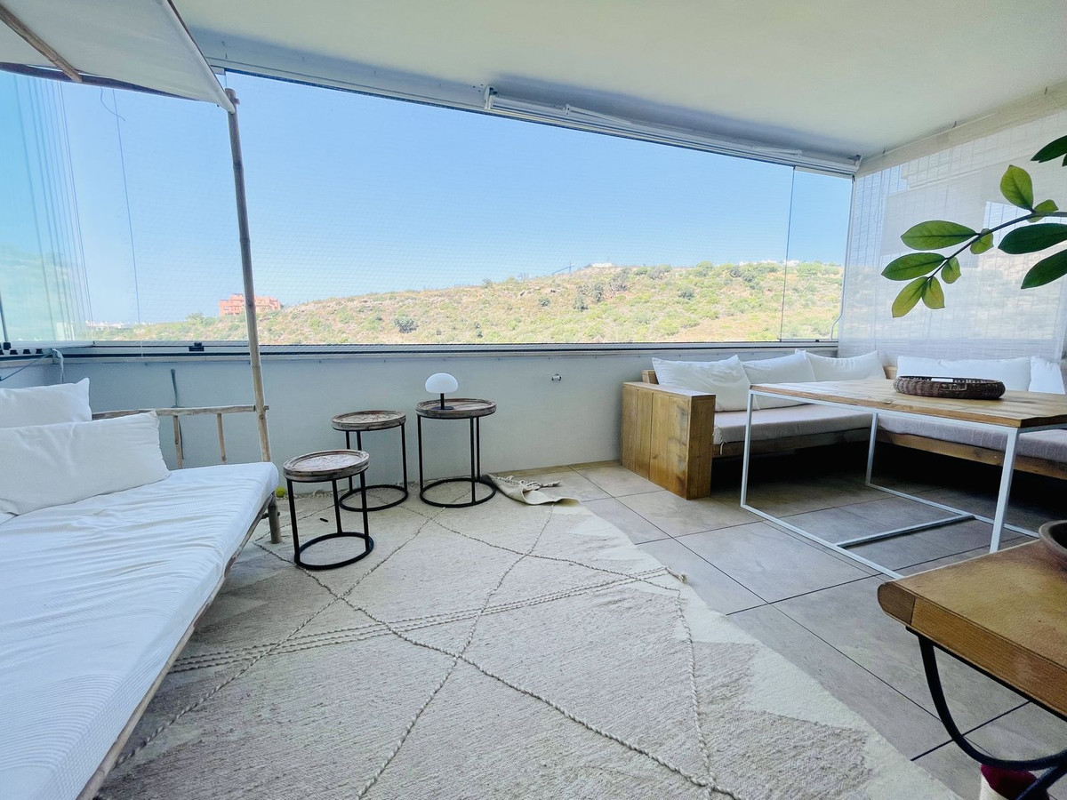 The spacious living room opens onto a southwest-facing terrace, transformed into a true additional living space thanks to the "cortinas de cristal" — frameless glass curtains. These adjustable panels allow you to enjoy the terrace year-round: fully open in summer, partially or fully closed depending on the season.