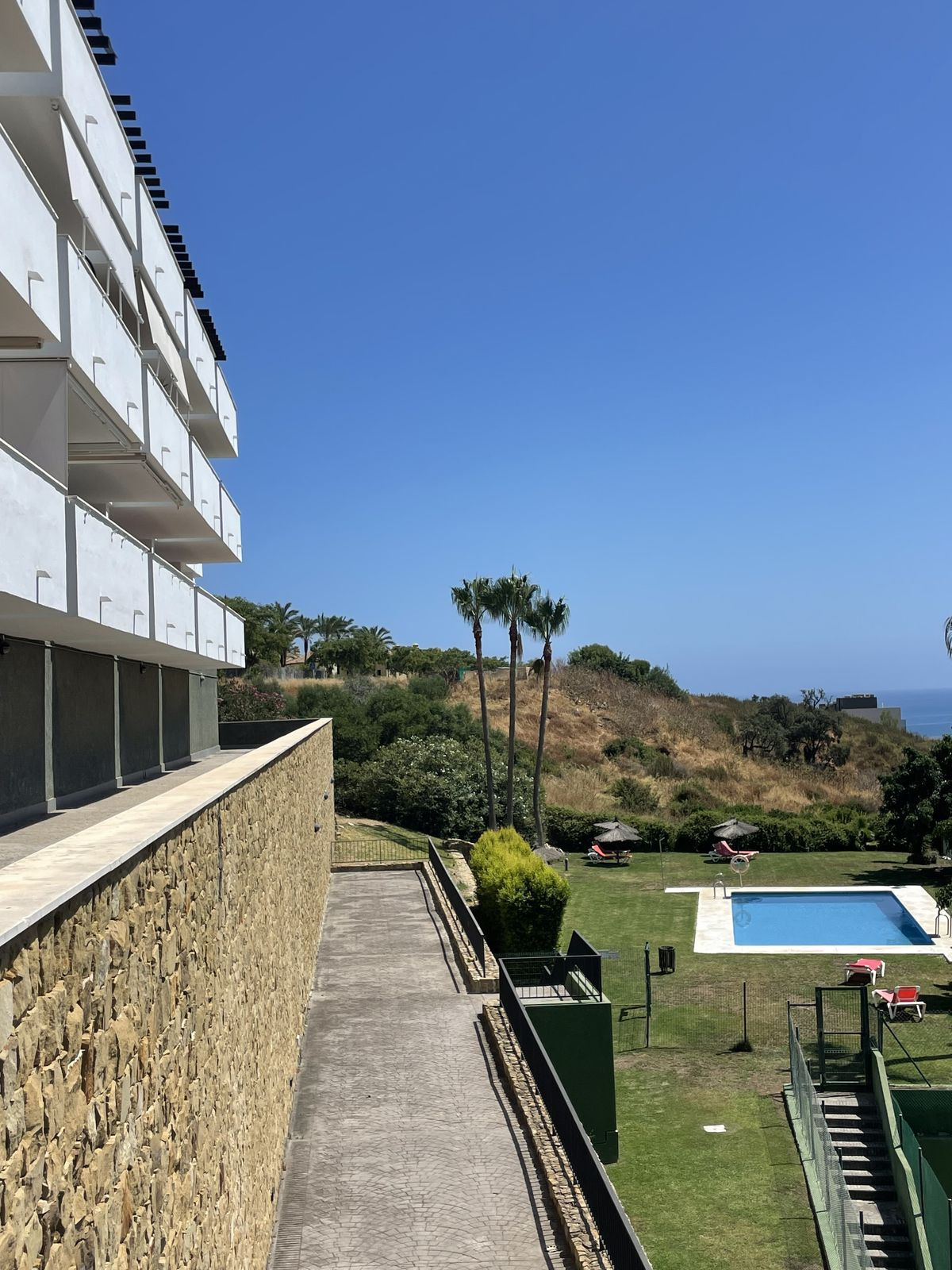 The terrace, slightly elevated to preserve the view even while seated, offers a breathtaking panorama of the Mediterranean, the Rock of Gibraltar, and the Moroccan coastline — all while maintaining privacy thanks to a discreet low wall.