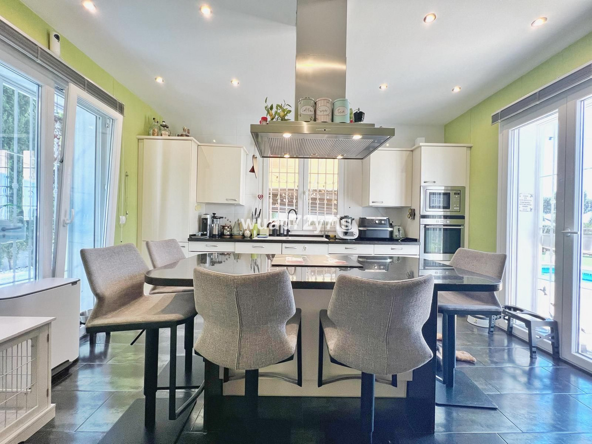 As you enter the villa, you are welcomed by a spacious entrance hall that leads into a large, open-plan living and dining area filled with natural light. The layout is designed to create a seamless flow between indoor and outdoor living, with large windows offering stunning views and direct access to the garden and pool area. To the left, behind elegant sliding doors, you'll find a modern and fully equipped kitchen that combines functionality and style, ideal for both everyday life and entertaining guests.