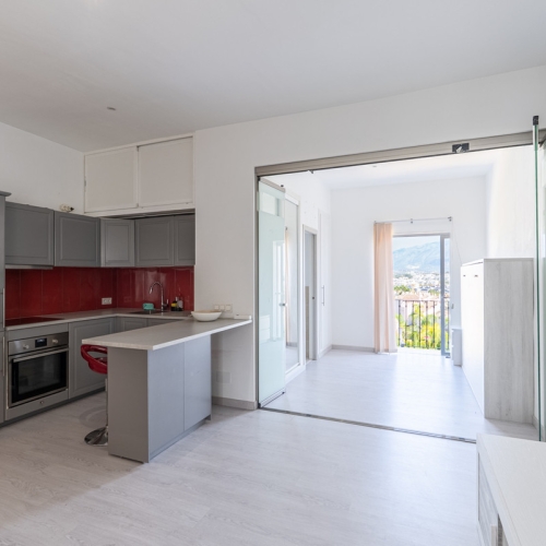 The apartment's interior is bright and inviting, with an open-plan living and dining area that seamlessly connects to a generous private terrace. Large windows and sliding doors fill the space with natural light and frame beautiful views of the coastline and sea, creating a relaxing atmosphere throughout the home. The kitchen is practical and well laid out, suitable for both daily living and entertaining guests.