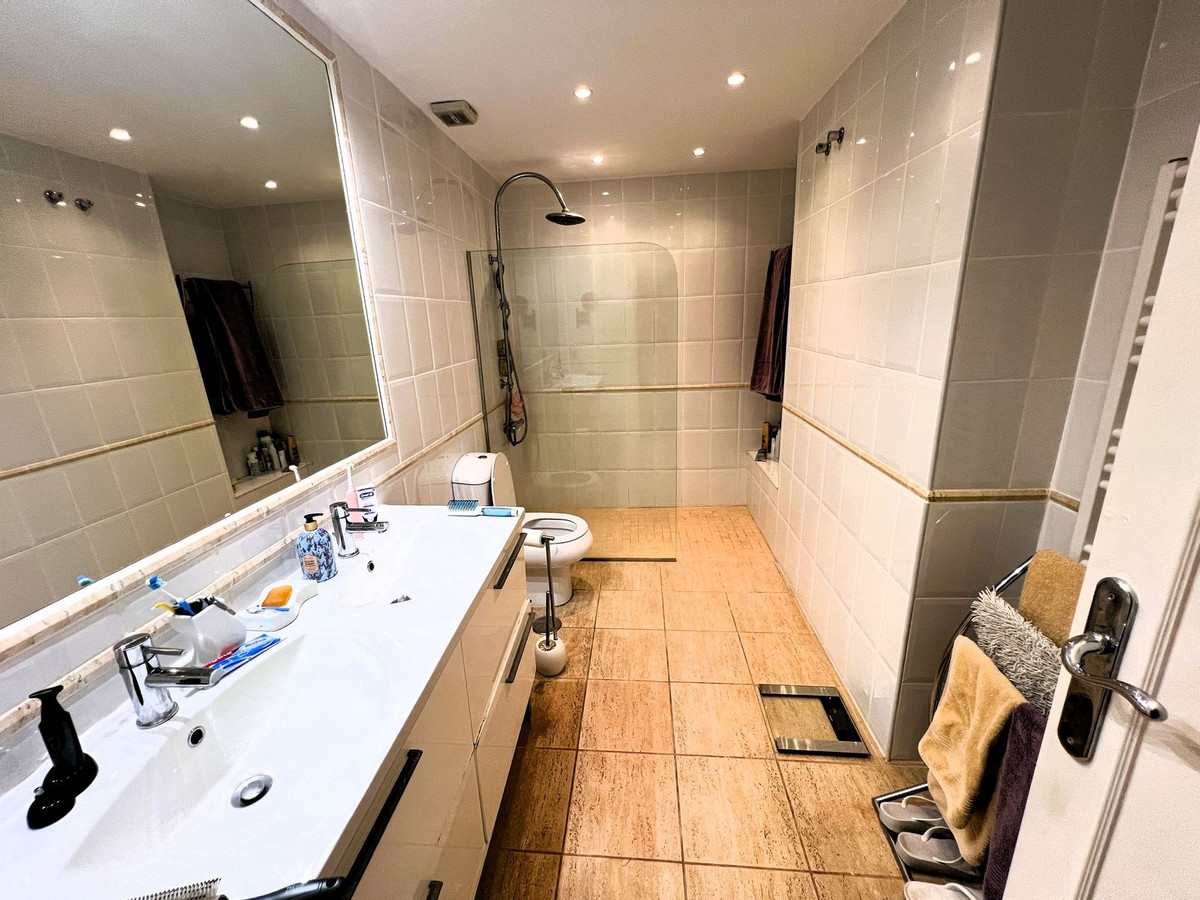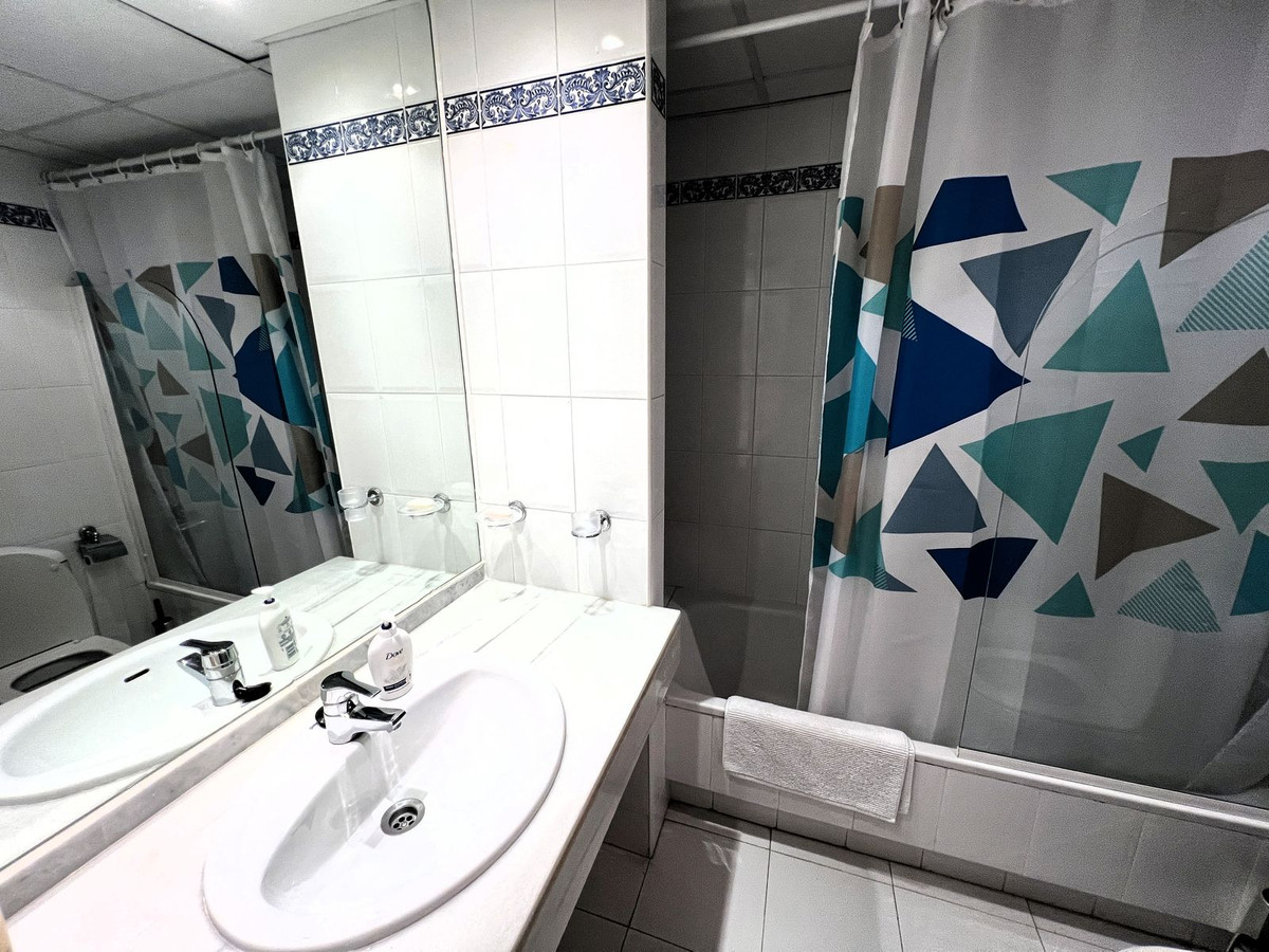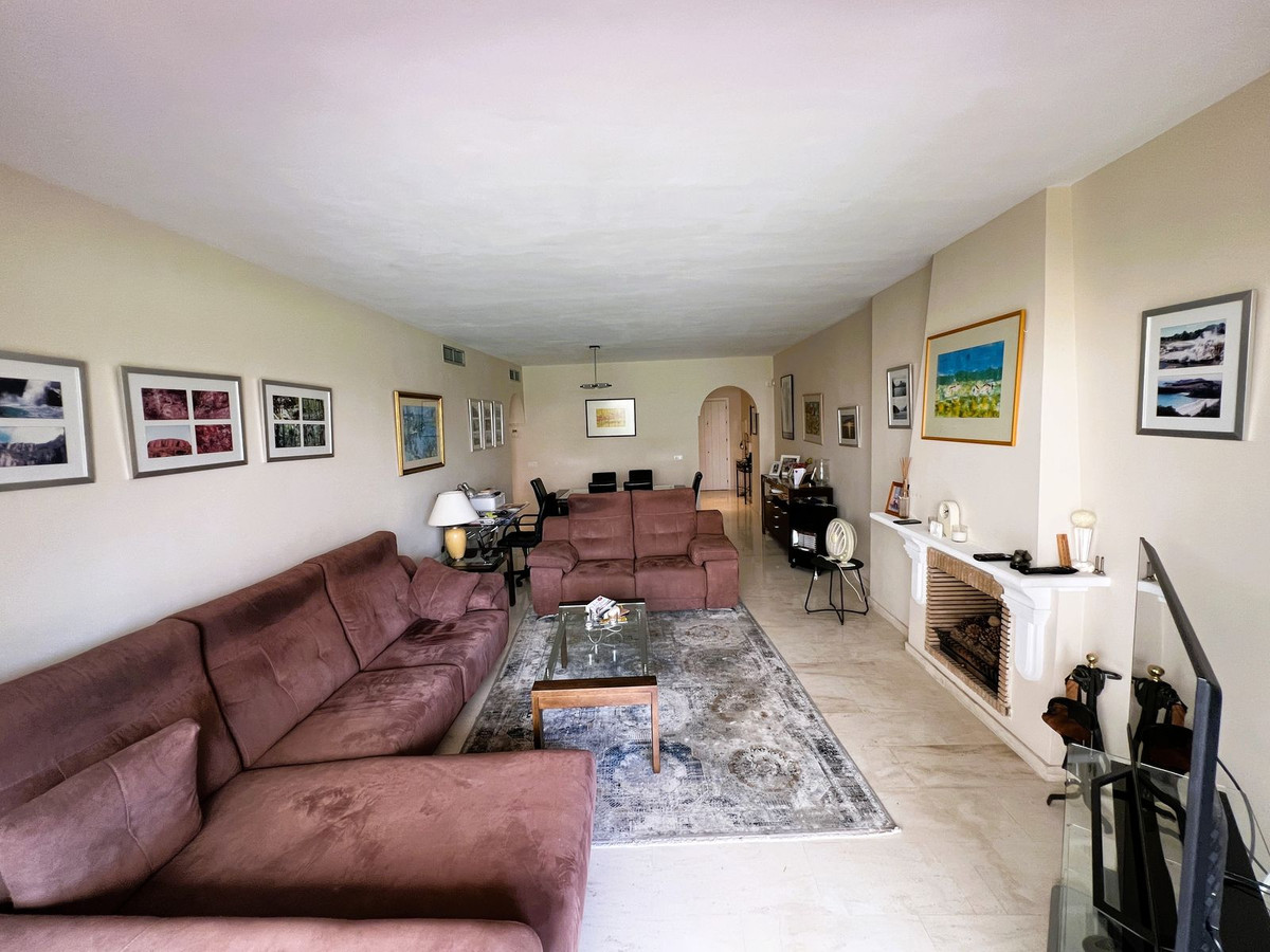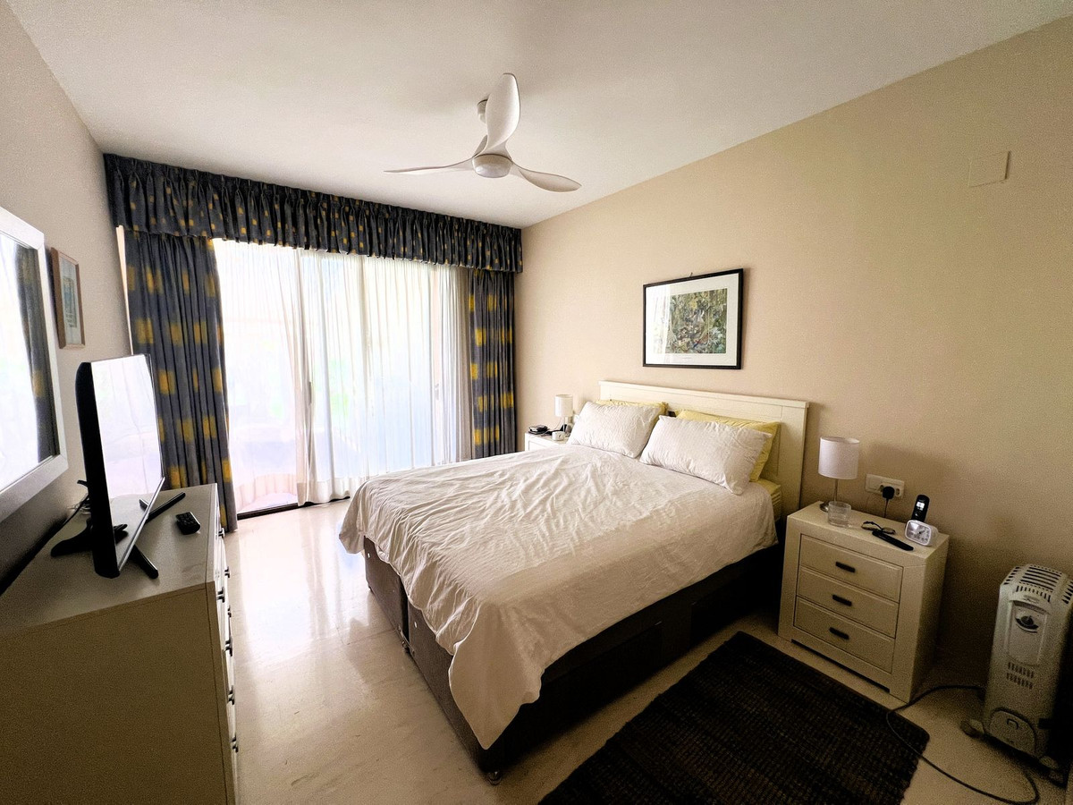 As soon as you enter the apartment, you can't help but notice the generous proportions which are unusual in two bedroom apartments in the area. The living room / dining room offers spaces for watching tv, socialising with friends and desk work. It has a working fireplace for winter evenings as well as hot and cold air-conditioning. This room leads out on to a large private terrace and the beautiful and very extensive gardens of this, the third phase of the complex. There is one of the three community swimming pools just a few metres away. The kitchen has also been modernised and benefits from an additional aired laundry area.