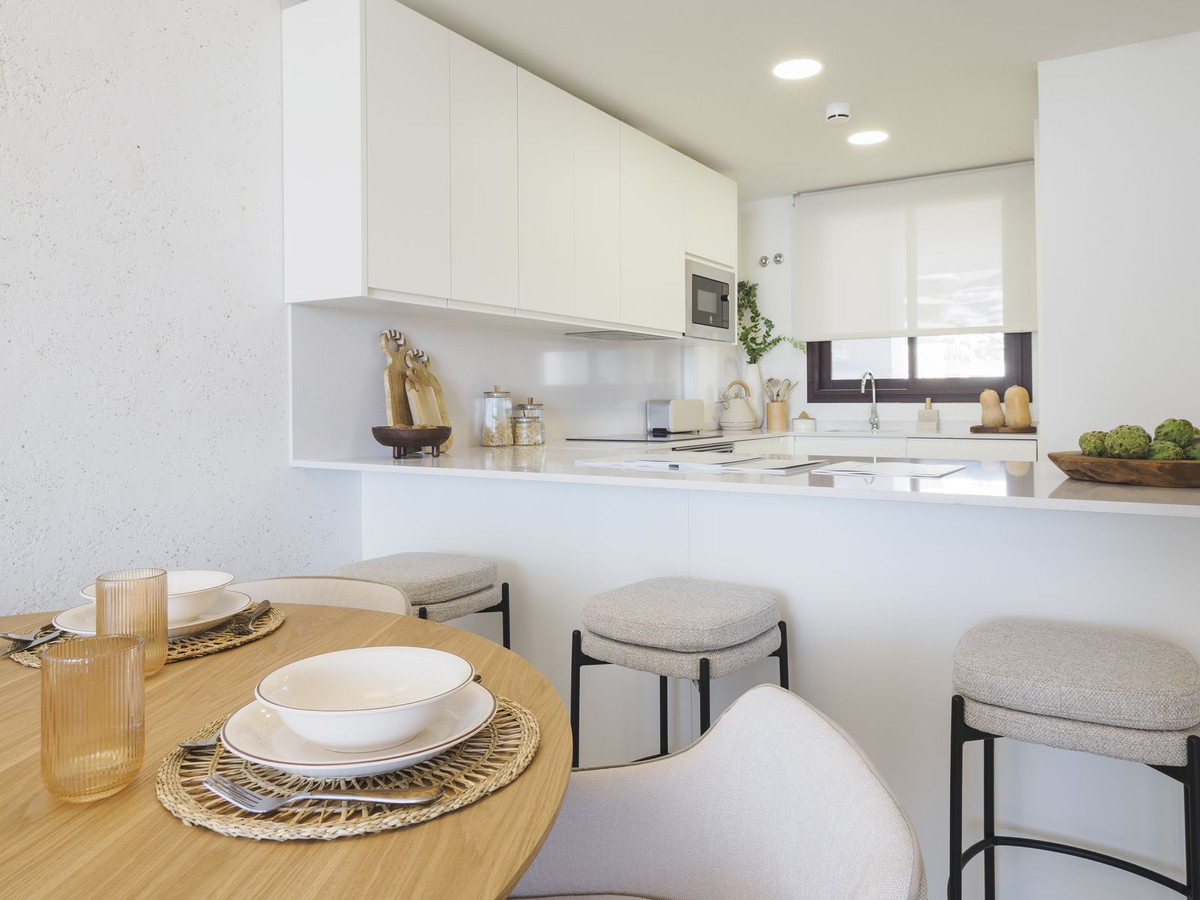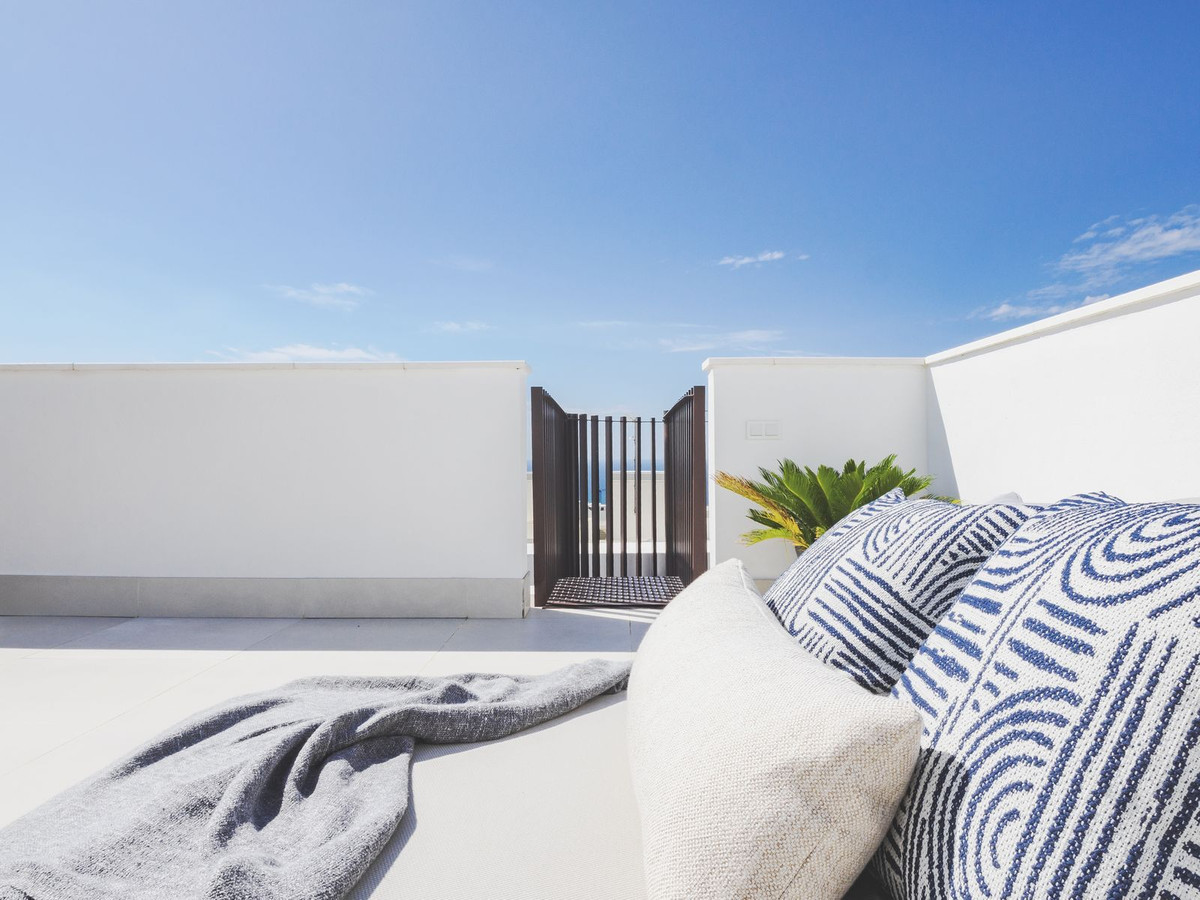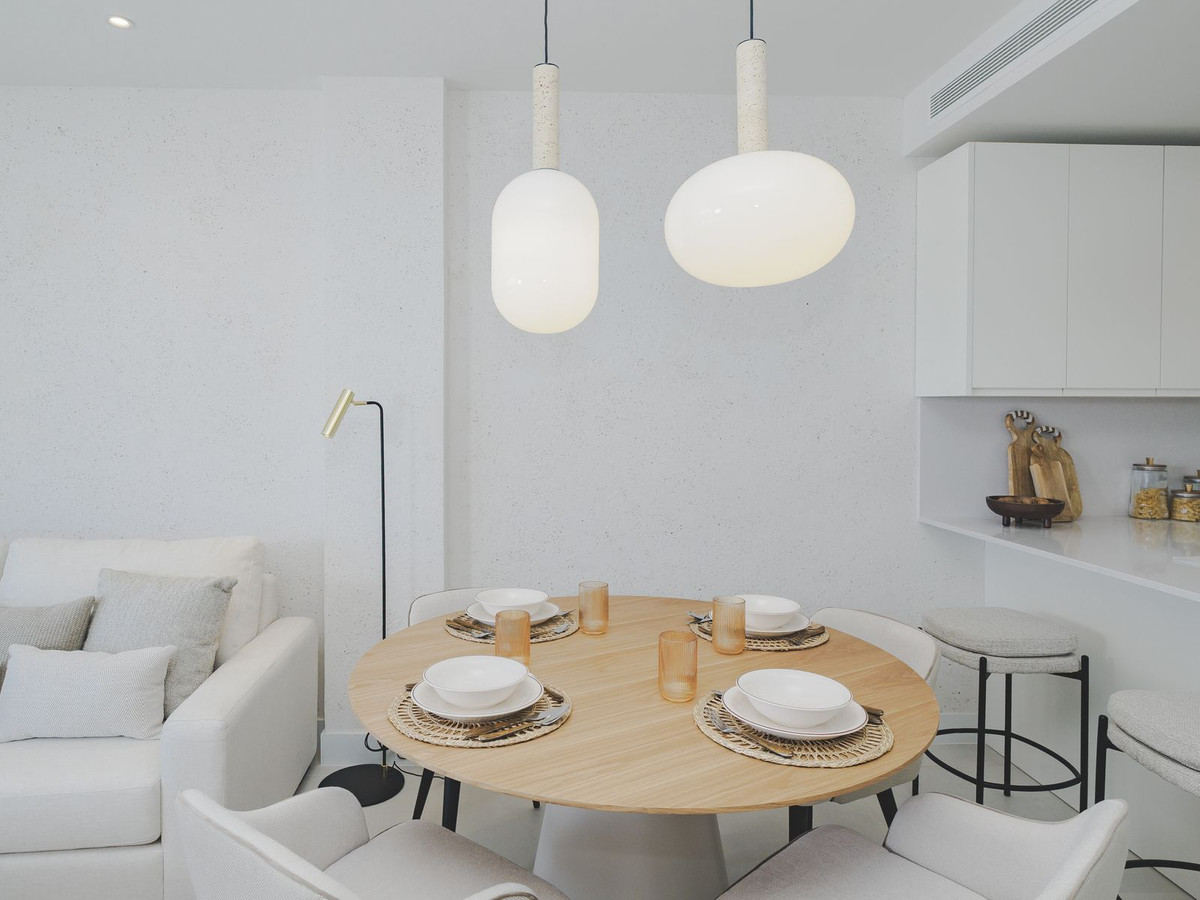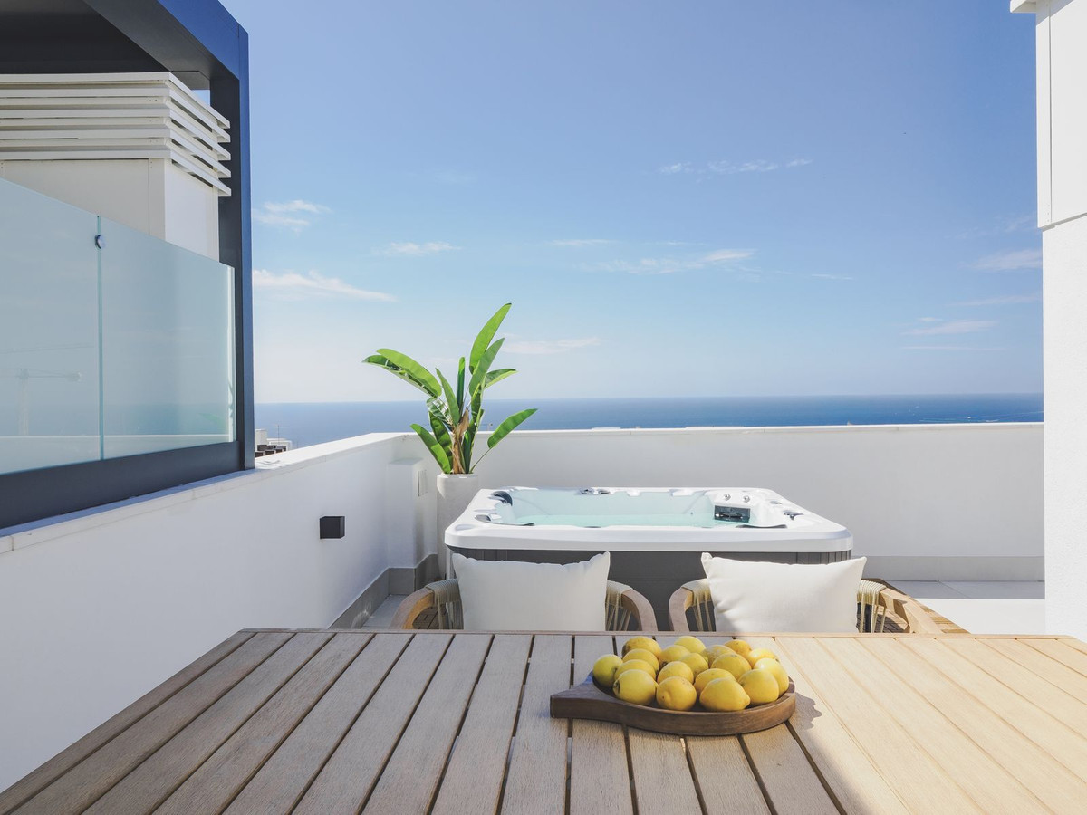 The property consists of 2 spacious bedrooms. The designer kitchen is open to the living room. From the living-dining-kitchen room, we have access to the main terrace of 27m2, and from this terrace we access the solarium floor, where we have a barbecue and a jacuzzi for 4 people.