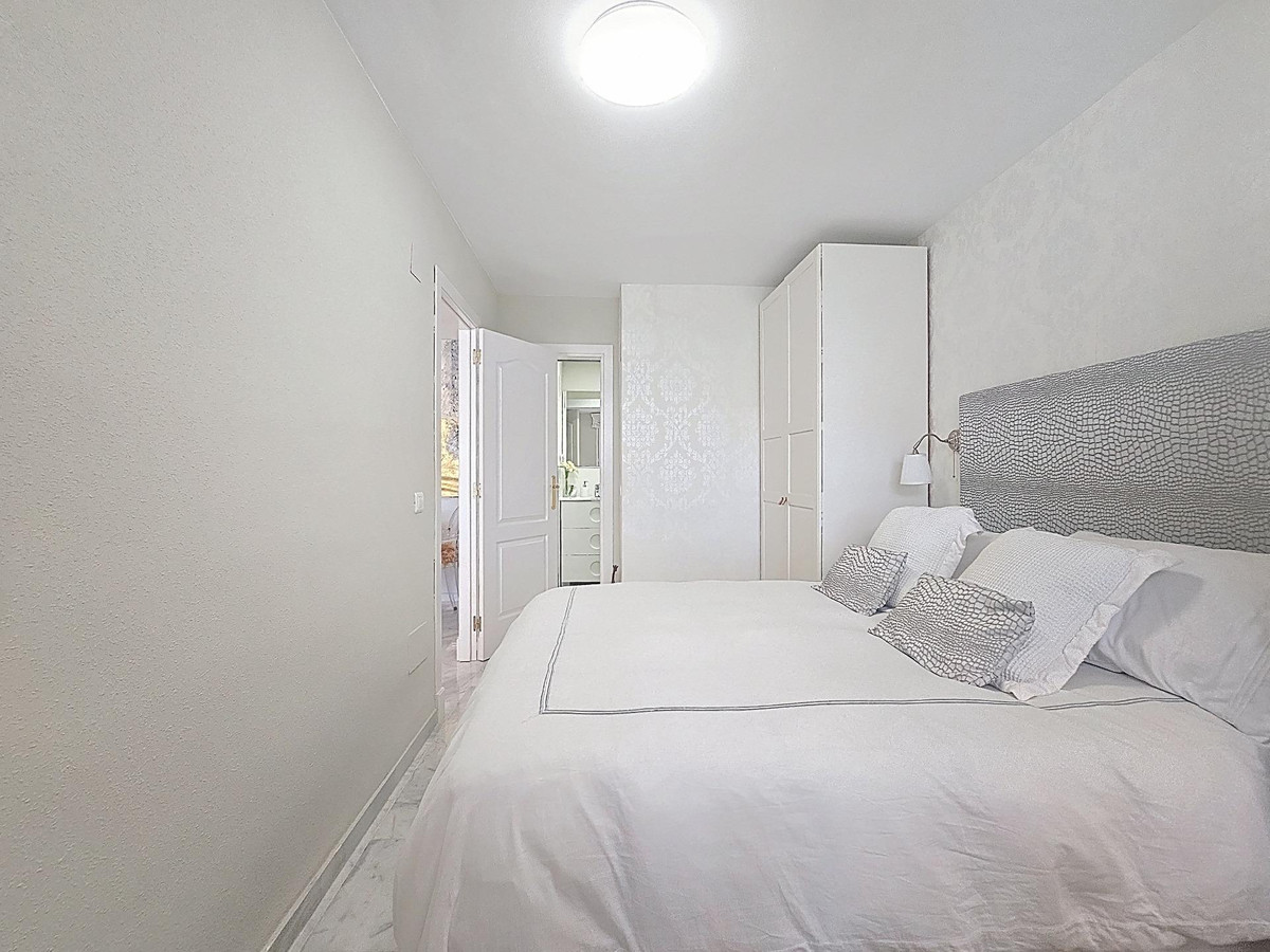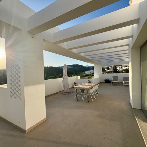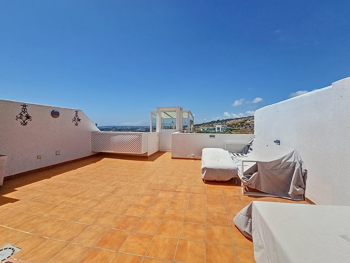 Located in the peaceful and sought-after urbanization of Hacienda Casares, near the prestigious Doña Julia golf course, this 3-bedroom, 2-bathroom apartment stands out for its excellent condition and high-quality features. The master bedroom has its own en-suite bathroom, recently renovated with modern materials, offering a private and comfortable space. The independent kitchen is fully equipped with high-end appliances, perfect for cooking enthusiasts. The living area opens onto a pleasant terrace enclosed with a Lumon system, ideal for year-round enjoyment, and stairs lead up to a spacious private solarium of 72 m² boasting spectacular views of the Mediterranean Sea and the Doña Julia golf course. The property also includes a private parking space and a storage room, adding extra convenience to daily life. Close to the beaches, La Duquesa marina, and all amenities, this apartment is perfect as a primary residence or holiday home.