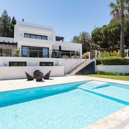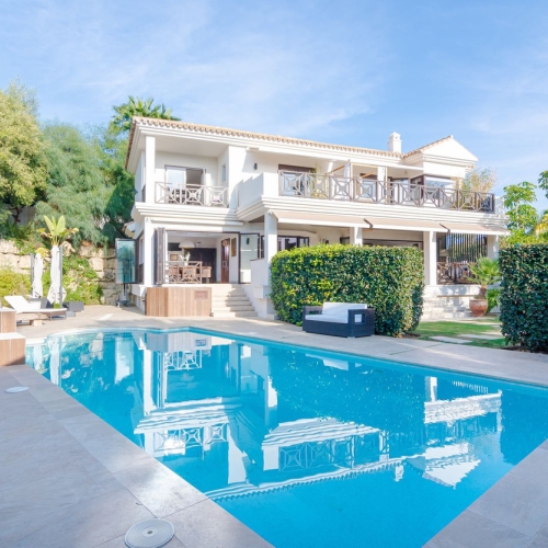 This lovely four-bedroom, newly renovated villa is located in the residential area of Nueva Andalucía, within the secure, gated community of Marbella Country Club.