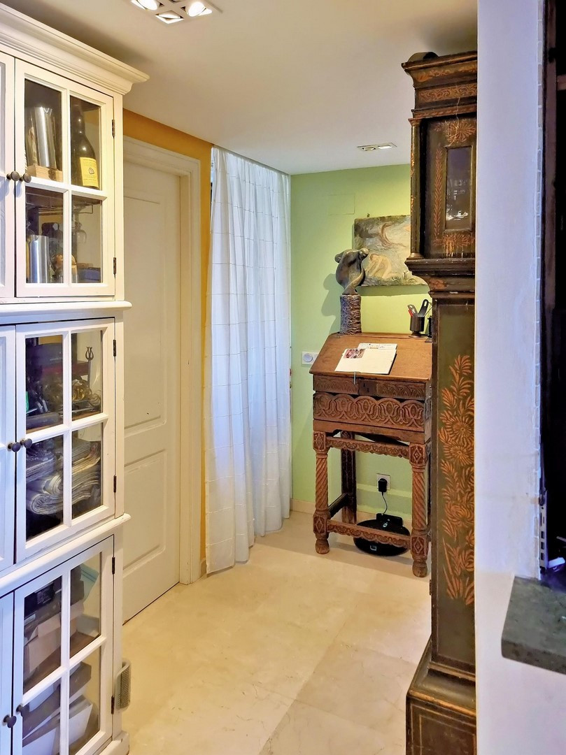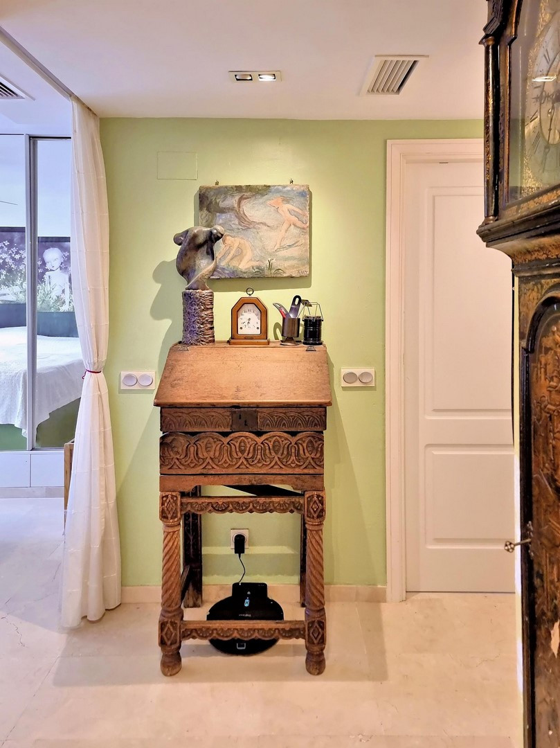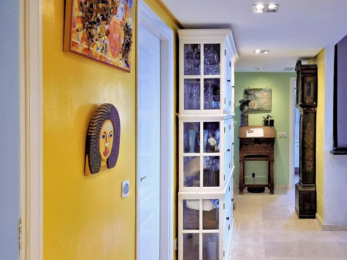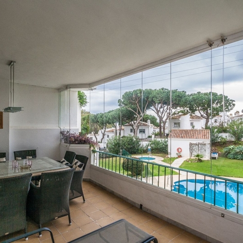 Spacious and bright south-facing corner apartment in Calahonda, combining spaciousness, comfort, and spectacular sea and mountain views. Originally with three bedrooms, it has been converted into two, integrating one bedroom into the living room to create a larger and more versatile space. It has two bathrooms, a dressing room, a laundry room, and a partially furnished kitchen. The property has a covered terrace, ideal for enjoying the weather and sea views, and also has an underground garage and storage room. Its corner location guarantees greater privacy and natural light. Features include hot/cold air conditioning, marble floors, double glazing, built-in wardrobes, and wheelchair access. The development offers two communal swimming pools, well-maintained gardens, an intercom, a gated community, and excellent maintenance. Located on a quiet one-way street, it is within walking distance of restaurants and a 5-minute drive from buses, supermarkets, golf courses, tennis courts, and the beach. A unique opportunity to live in one of the most sought-after areas of the Costa del Sol, perfect as a permanent residence or investment.