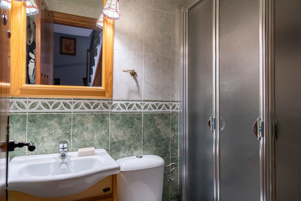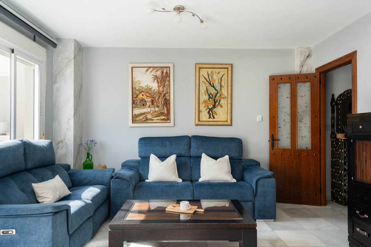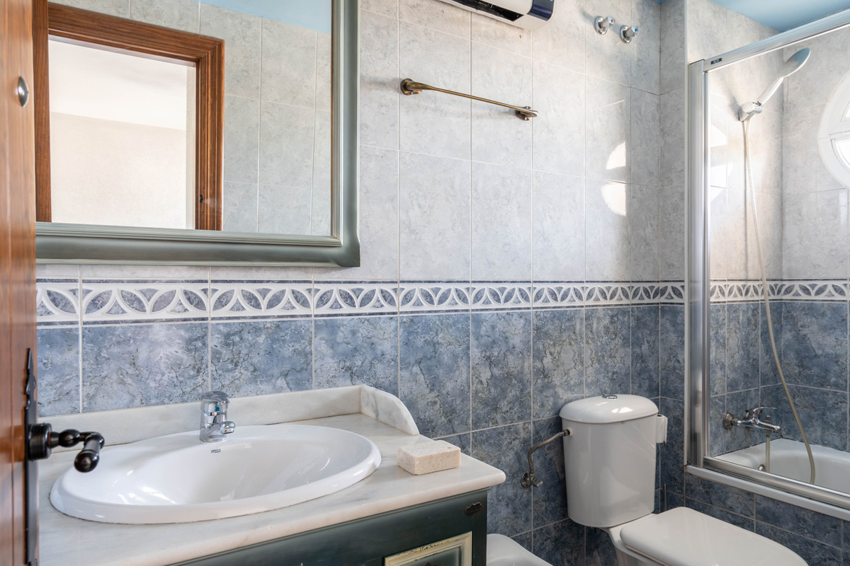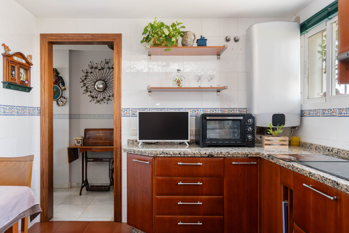 On the main floor, you'll find a bright open-plan living and dining area that flows seamlessly onto a private east-facing balcony with partial views towards Málaga city and the Mediterranean Sea. While not direct water views, the setting still offers a serene coastal ambiance. The separate kitchen is well-appointed and functional, ideal for everyday living or entertaining.