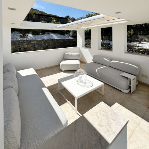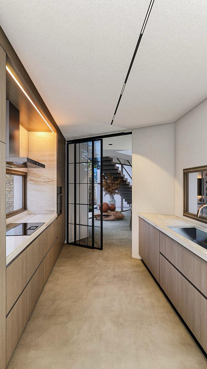 The house is distributed over two floors. On the ground floor, there is a spacious double-height living room with large windows that flood the space with natural light and open directly to the pool. There is also a dining room, a fully equipped independent kitchen with the best appliances and furnishings, a bedroom, and a full bathroom. The kitchen is directly connected to a fully equipped outdoor barbecue area with sea views.