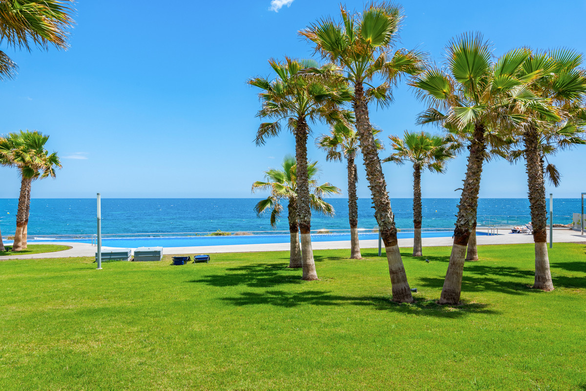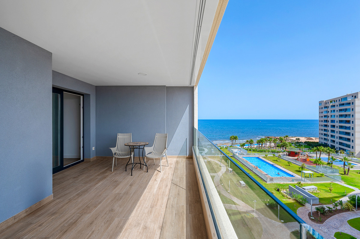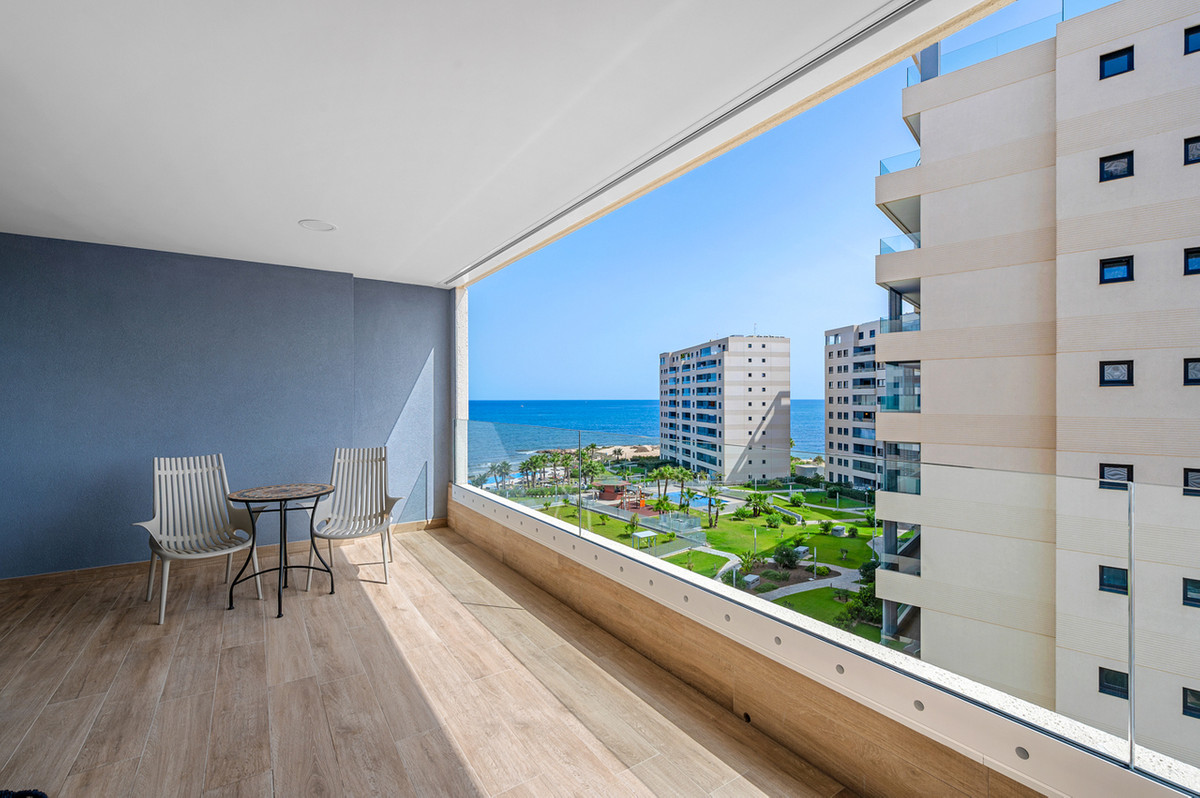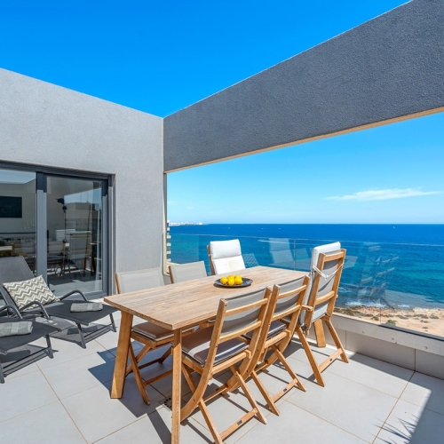 Fantastic exclusive frontline luxury apartment with 2 bedrooms, on the 5th floor, with sea views situated in the popular area of Punta Prima, Alicante.