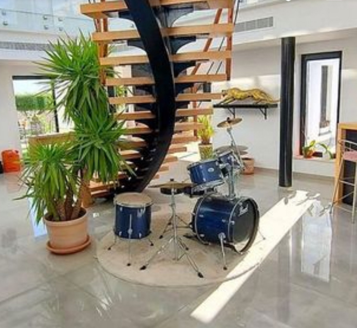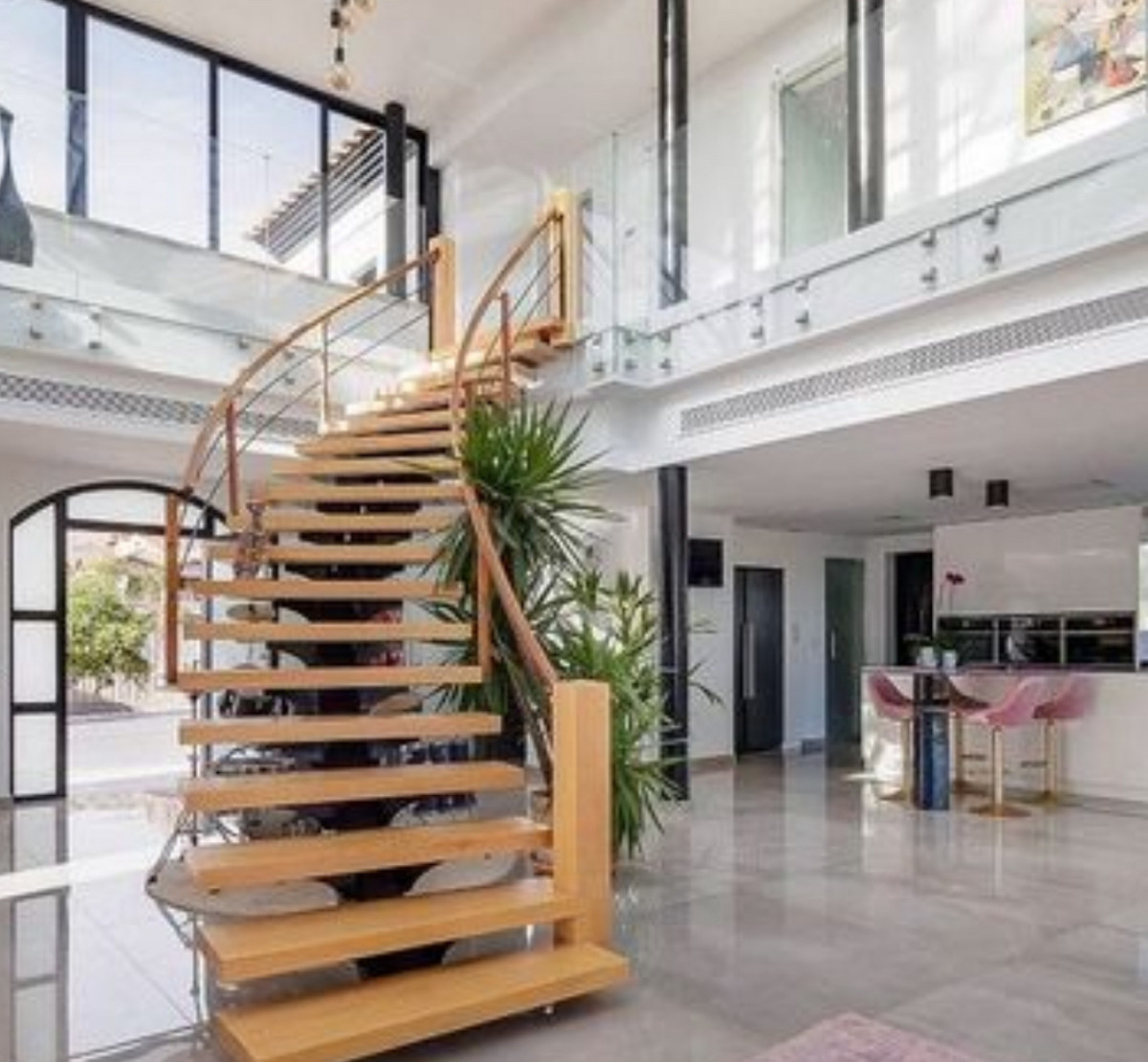 - Open-plan living room with an industrial design curved staircase, wooden details, and a black marble fireplace.