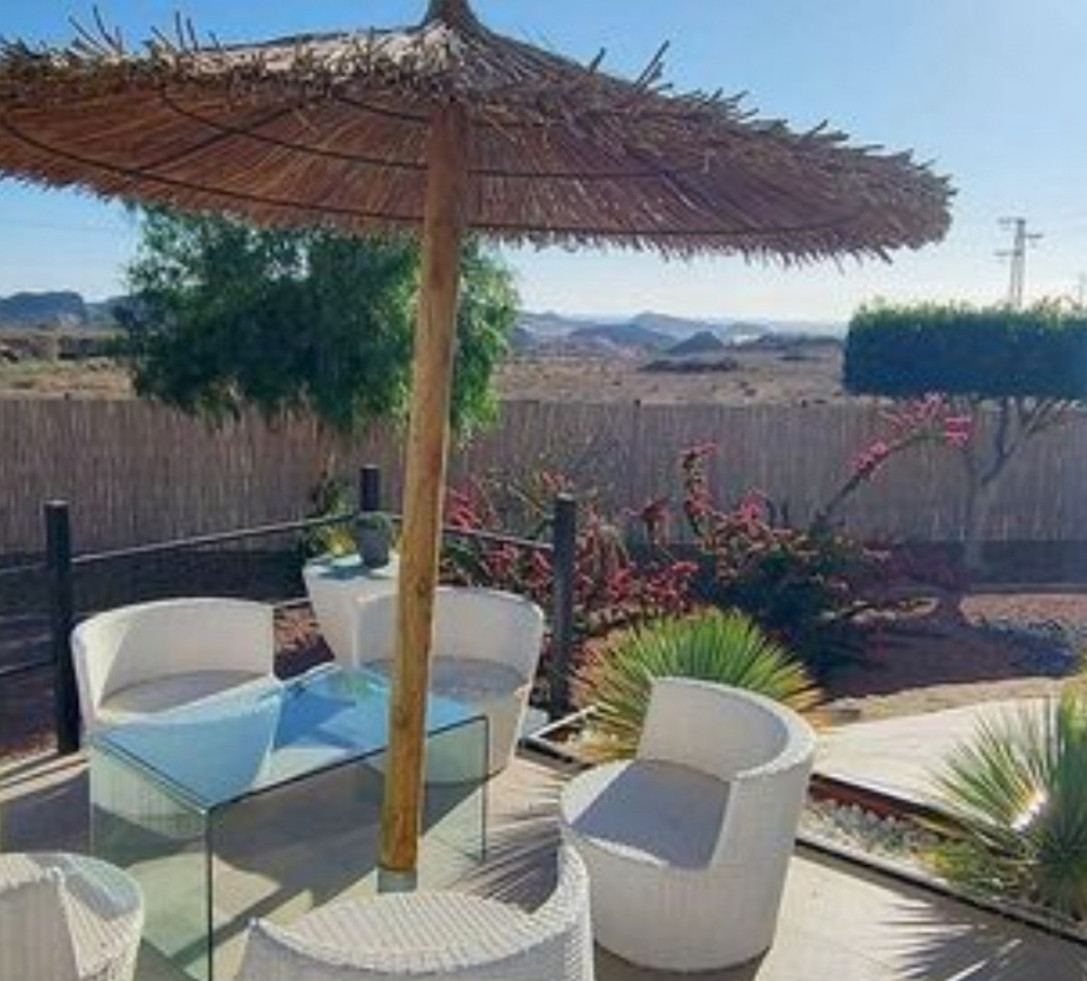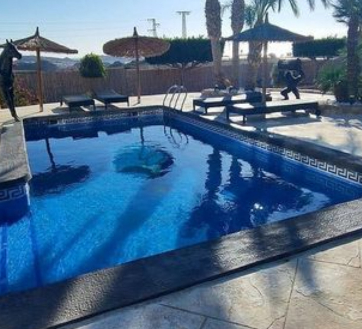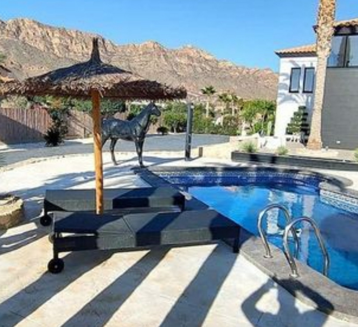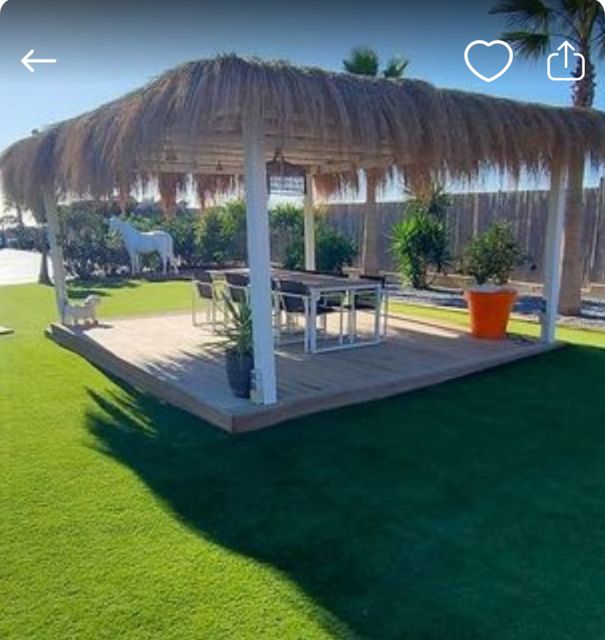 - 32 m² pool with solar shower, loungers, and esparto grass umbrellas.
