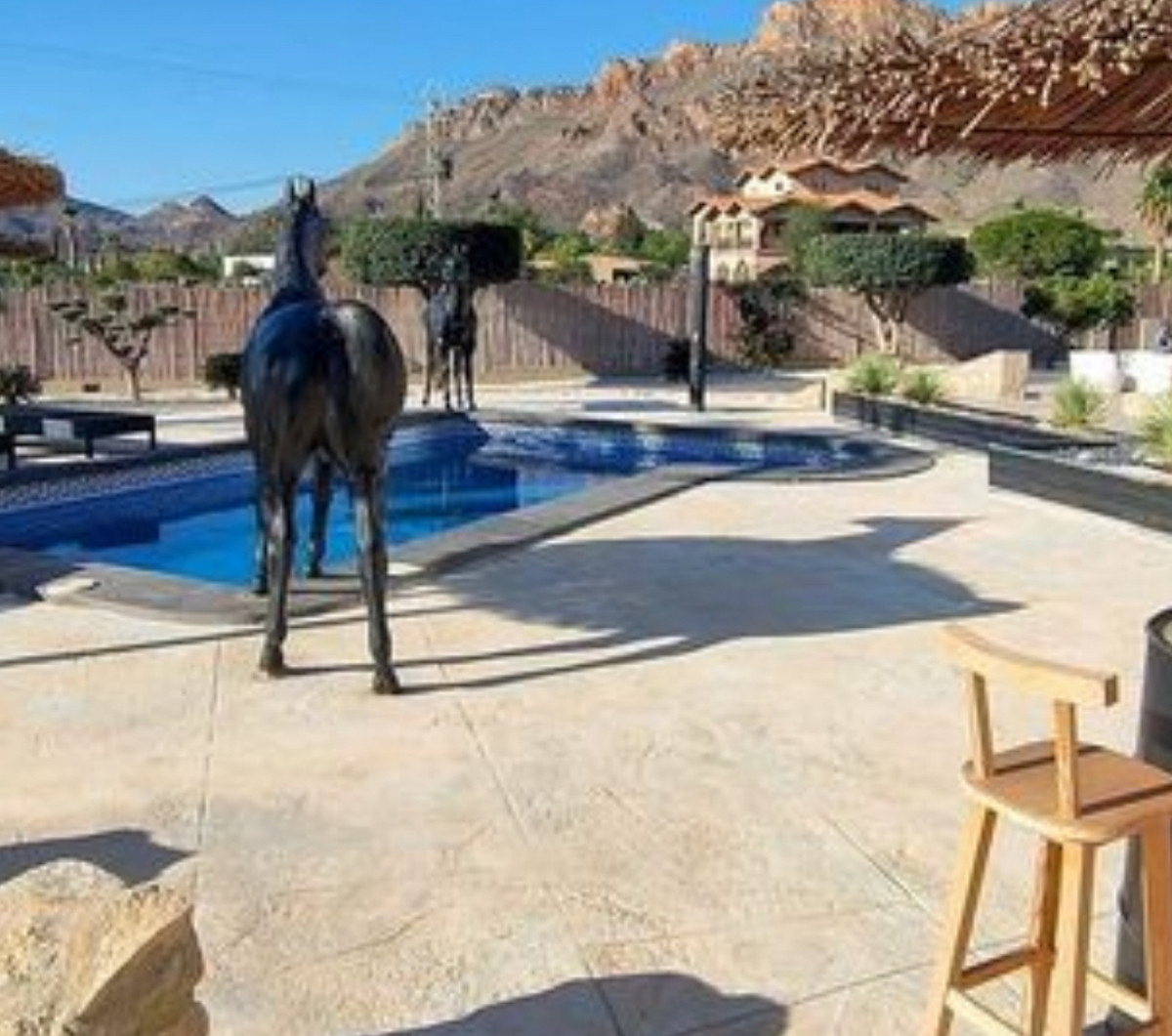 - Unique details such as horse sculptures with Louis Vuitton print and black marble ball fountain.