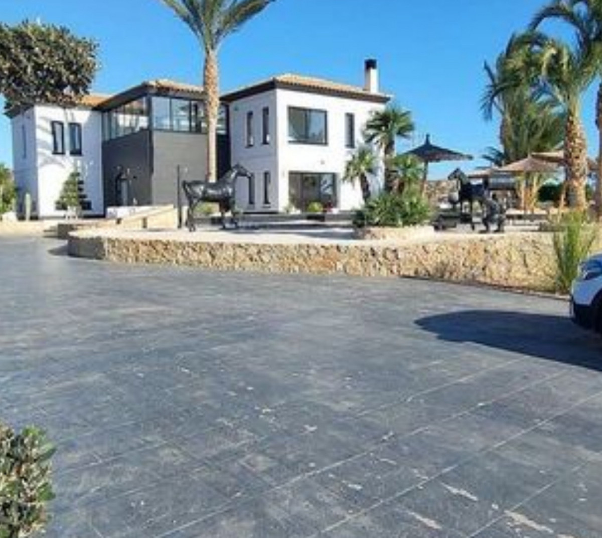 - Imposing entrance with cobbled access, water fountain, and security gate.