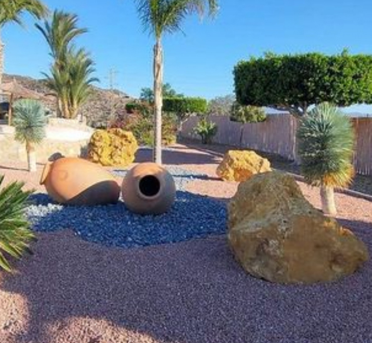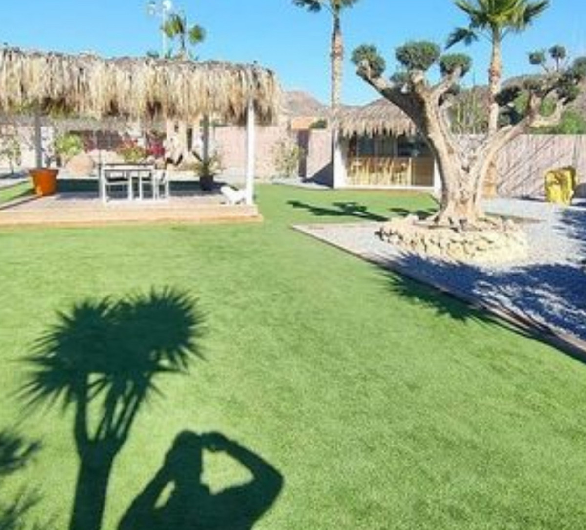 - Landscaped gardens with palm trees, mature plants, artificial grass, automatic irrigation, and decorative pathways.