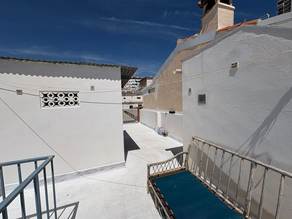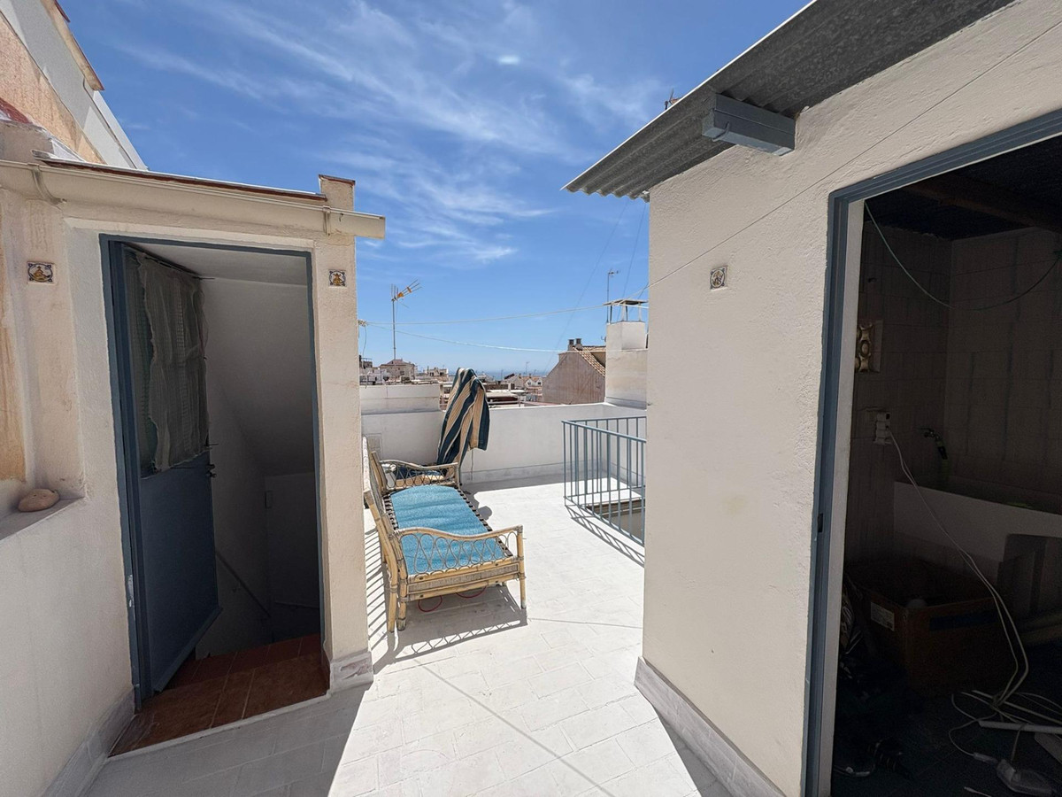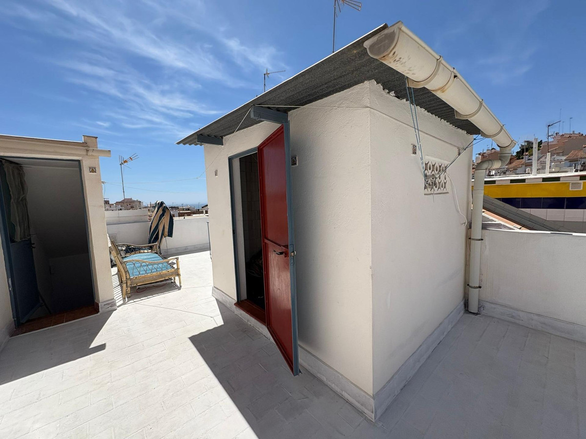 The property is distributed over two floors plus a spacious rooftop terrace. On the ground floor, you'll find one bedroom, a small bathroom, a cozy living room, and a functional kitchen with access to a small patio. The second floor features two bright bedrooms and a full bathroom. The terrace, approximately 45 m², includes a laundry room and boasts beautiful sea views, making it the perfect space to relax, enjoy outdoor dining, or create a chill-out area.