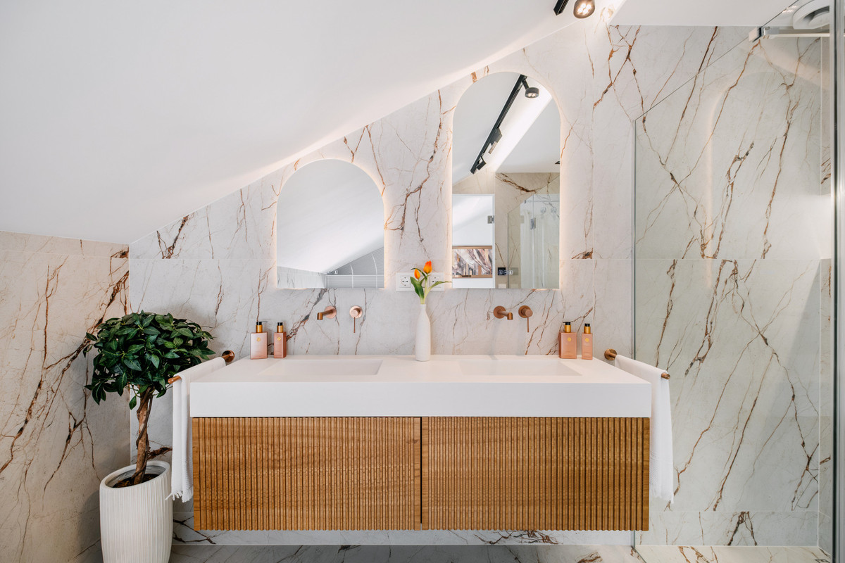The refurbishment, completed in 2025, combines natural materials, walnut wood details, and warm lighting to create a calm, modern interior. The main floor features an open-plan living and dining space with a well-equipped kitchen, including Siemens appliances, a stone island, double fridge, integrated wine cooler, and a separate butler's pantry.