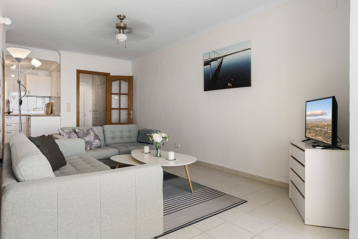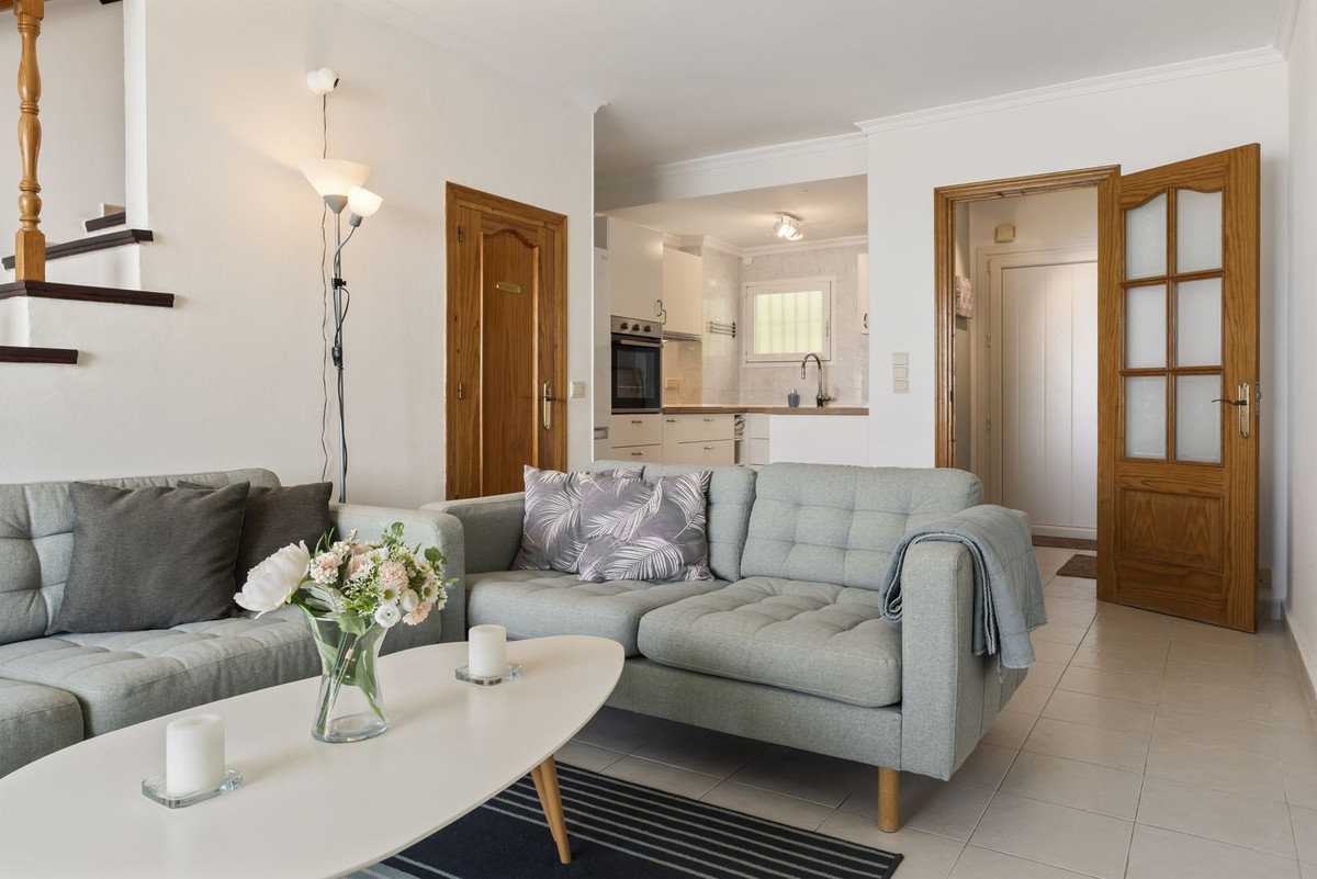 Lejligheden er renoveret og byder på 2 soveværelser, 2 badeværelser, en lys stue med en udvidet spisestue (omdannet fra det oprindelige terrasseareal) med foldeglasvinduer, der giver en semi-terrasseoplevelse, fuldt udstyret køkken samt en privat terrasse på 1. sal med udsigt til haven og Middelhavet.