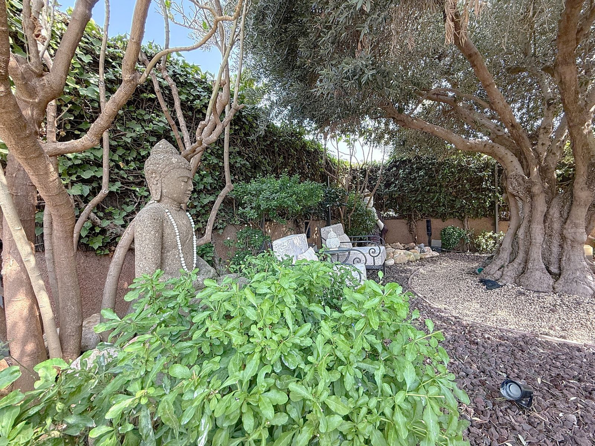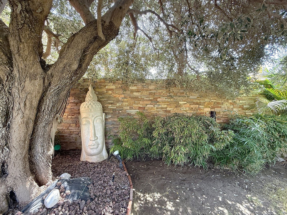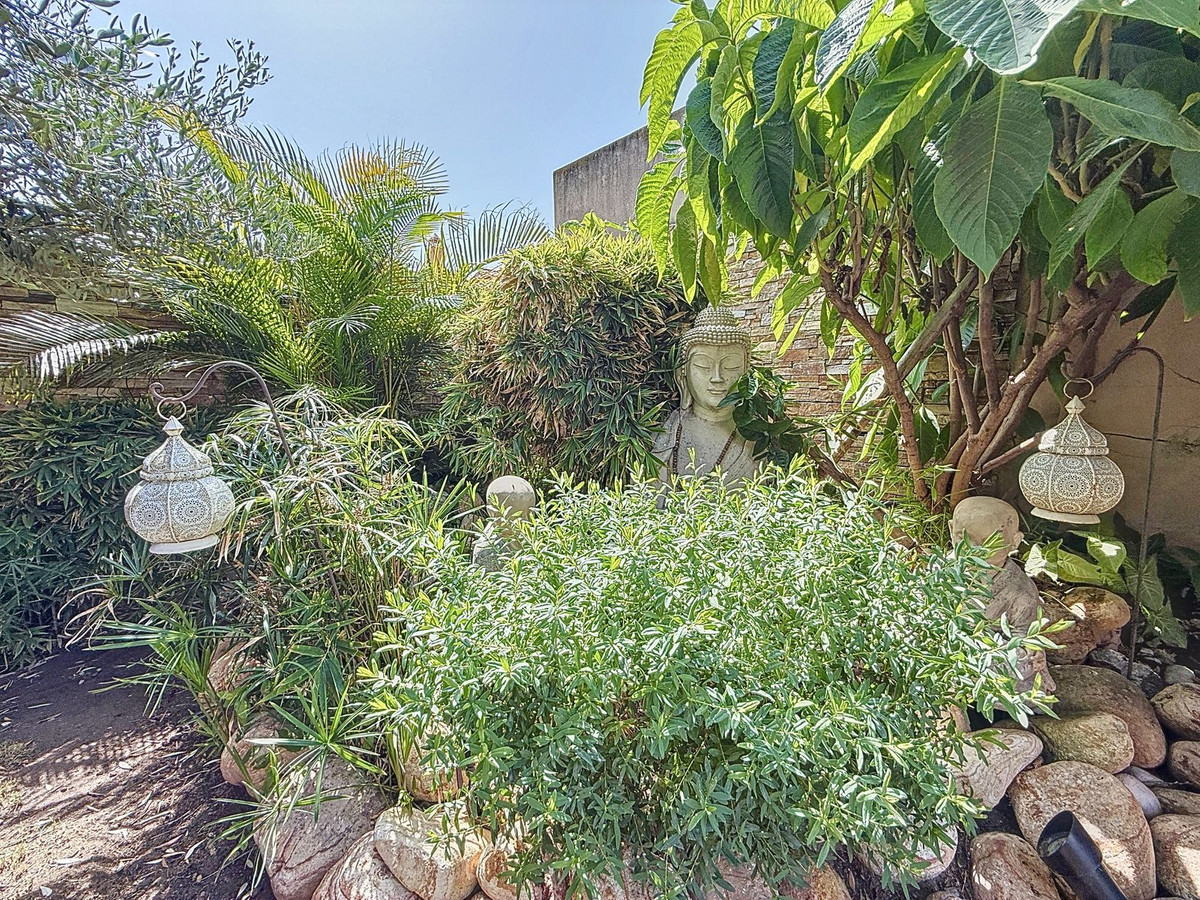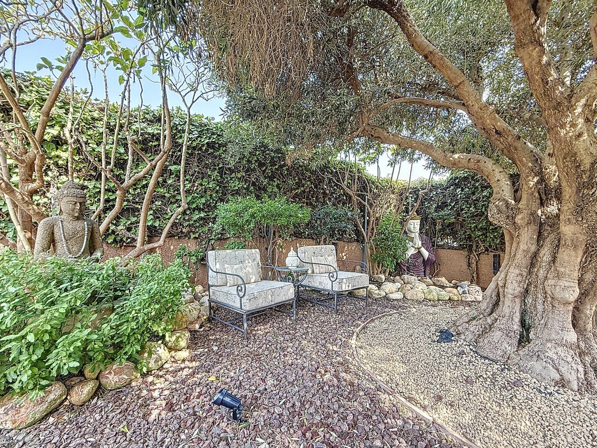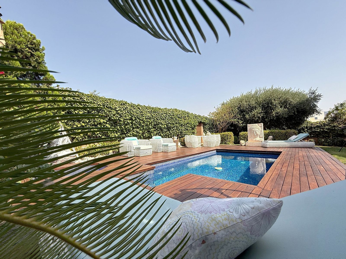 Fra det øjeblik du træder ind gennem den private port, omfavnes du af en følelse af ro. Haven er en verden for sig selv: et århundredgammelt oliventræ som vogter, Buddha-detaljer der skaber åndelig harmoni, skyggefulde terrasser og intime lounge-hjørner der inviterer til ren afslapning. I centrum ligger en 6x4 m pool med jacuzzi, omgivet af naturlig beplantning og skyggen fra modne træer – en sjælden oase på denne privilegerede beliggenhed.