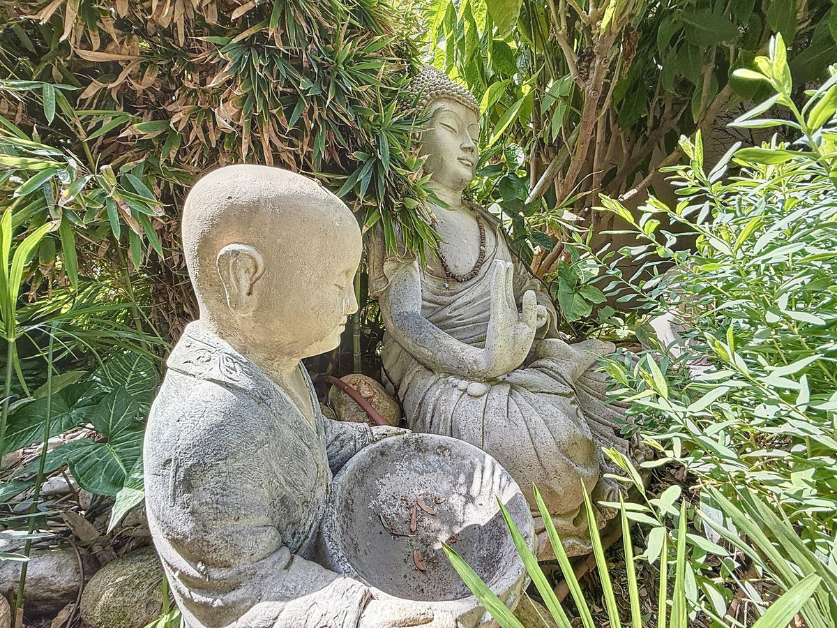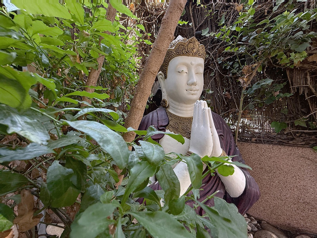Sjælfuld have med århundredgammelt oliventræ & Buddha-detaljer