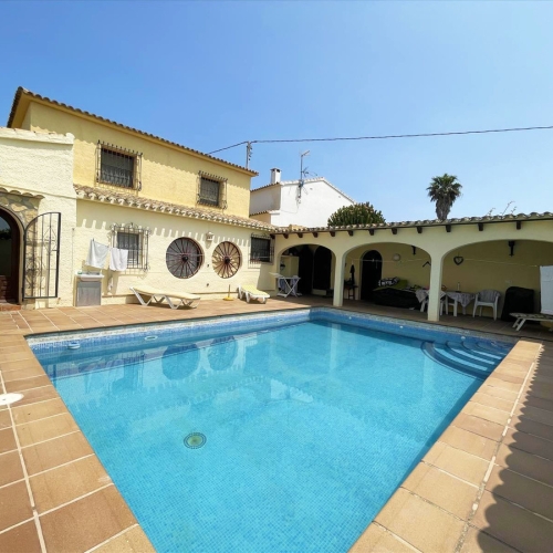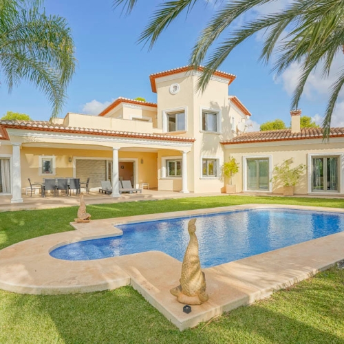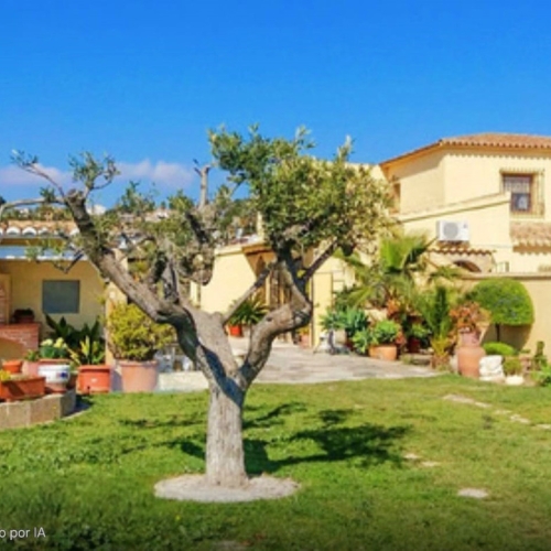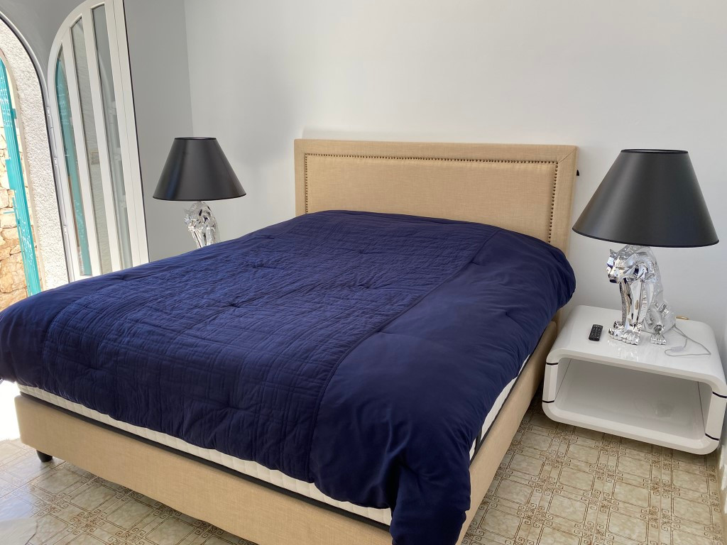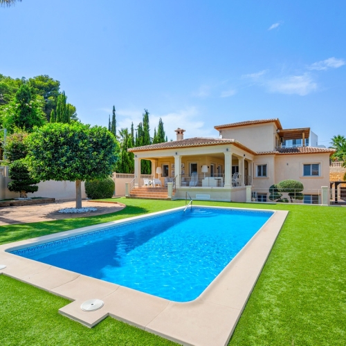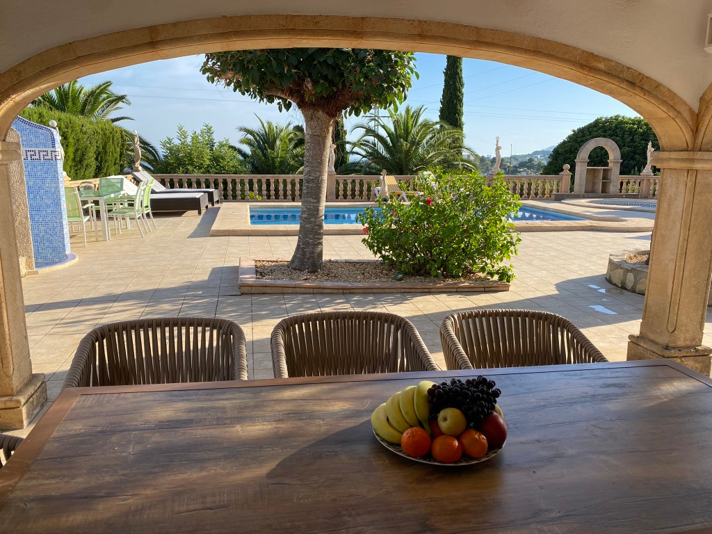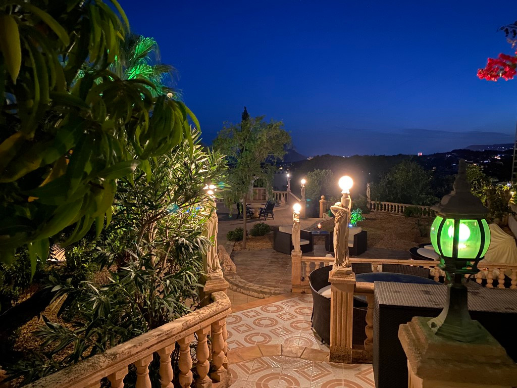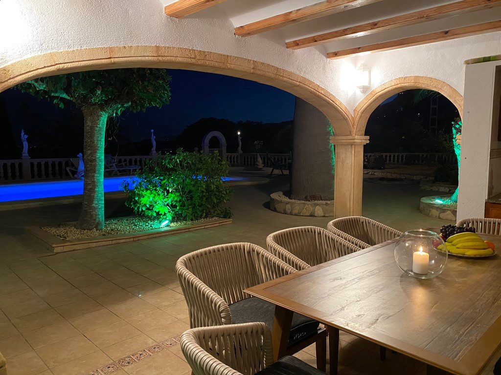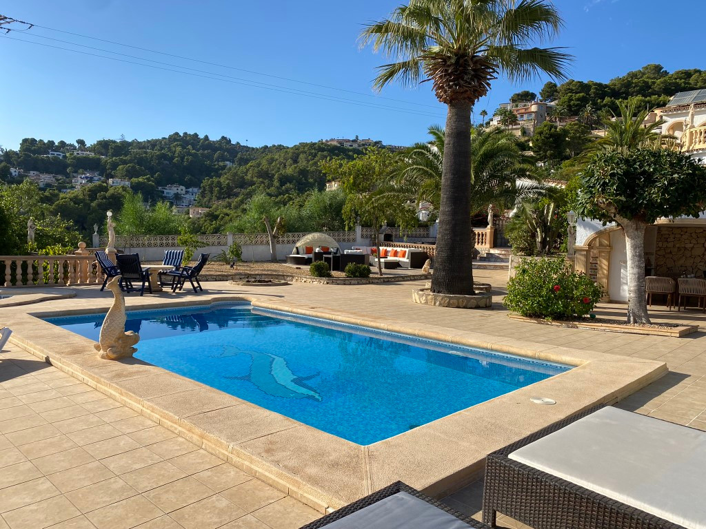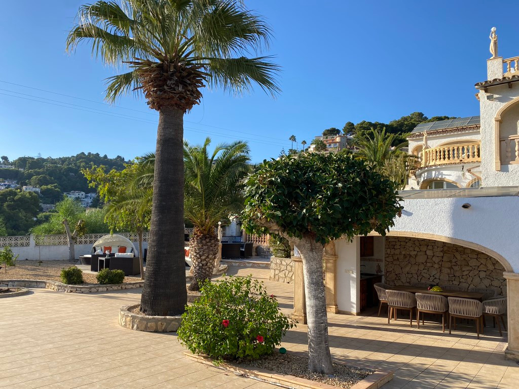 This very spacious traditional Spanish villa is located in a quiet location in the vicinity of the golf course in Moraira. The villa is located on a large plot and offers breathtaking views over the countryside and the sea. The villa is distributed over 2 floors and has a total of 4 spacious double bedrooms and 4 bathrooms. In addition, there is a spacious lounge with dining area, a fully equipped kitchen, a guest toilet, a laundry room and gym with sauna. The villa also has a very spacious terrace with various seating areas around the house from where you can enjoy the breathtaking views that this villa has to offer.