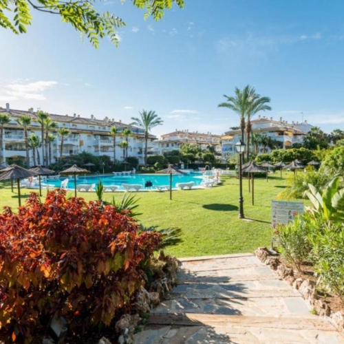 Welcome to this spacious 2 bedroom and 2 bathroom apartment in the well-kept and perfectly situated urbanization of Royal Gardens. The apartment has an open plan kitchen connecting nicely with the living area. The terrace has a dining area with beautiful views of the garden and the mediterranean see. The terrace also has a smaller part for barbeque or relaxing outside the master bedroom. This is the perfect place if you appreciate leaving the car in the garage while walking to the beach, shops or restaurants. In the near surrounding you find some of the best golf courses in the area. The apartment comes with a garage and a storage room which you can reach easily with the elevator. The urbanization is a secure and gated community with 24 h surveillance cameras.