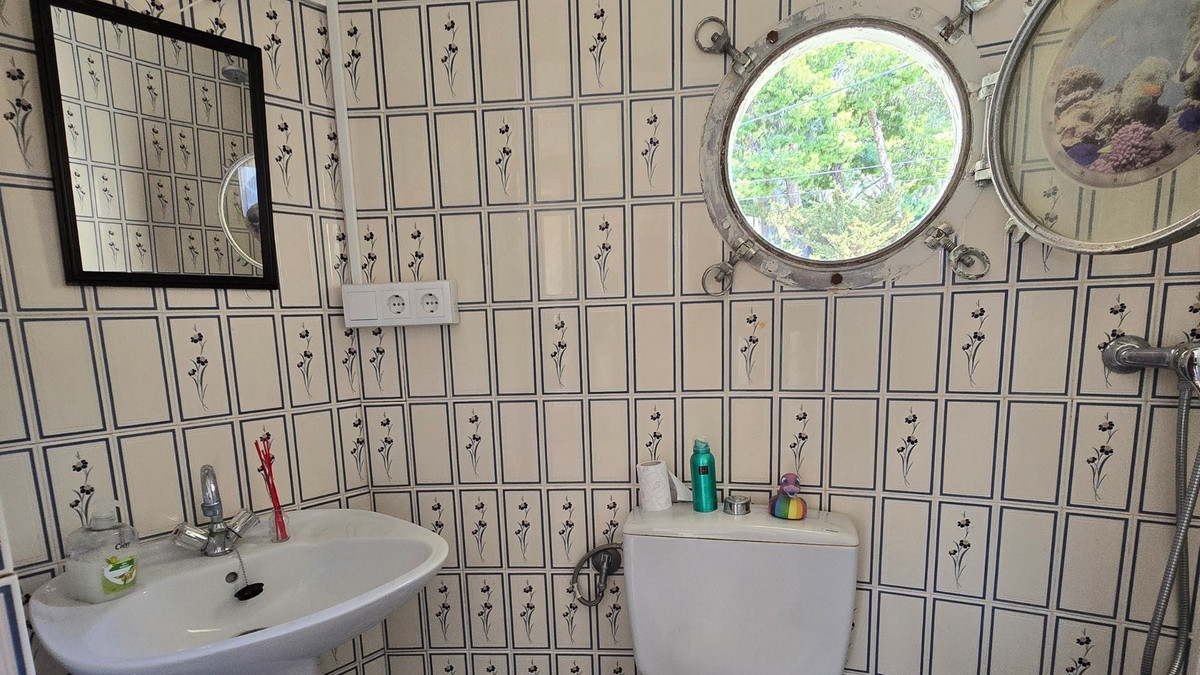 Descending from the main living area, the lower level hosts the master bedroom, complete with an en suite bathroom, a walk-in closet, and direct access to the swimming pool. On this same level you'll also find the so-called seaman's room, a charming lounge with direct views and access to the pool terrace. From here, a staircase leads down to an additional guest apartment with its own open kitchen, bathroom, and private bedroom. This space requires renovation, but holds fantastic potential as a fully independent guest suite.
