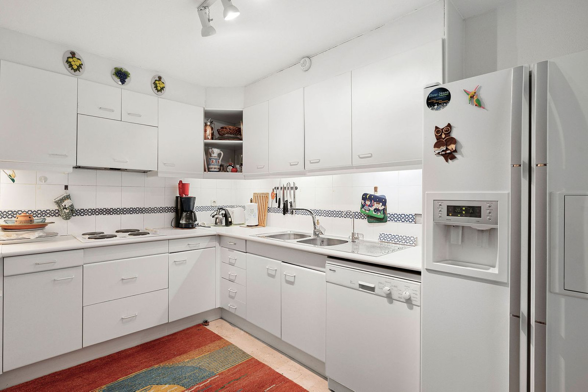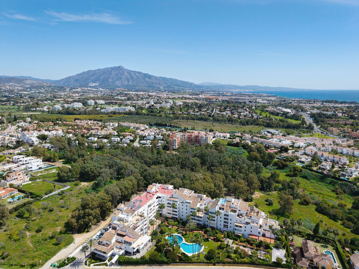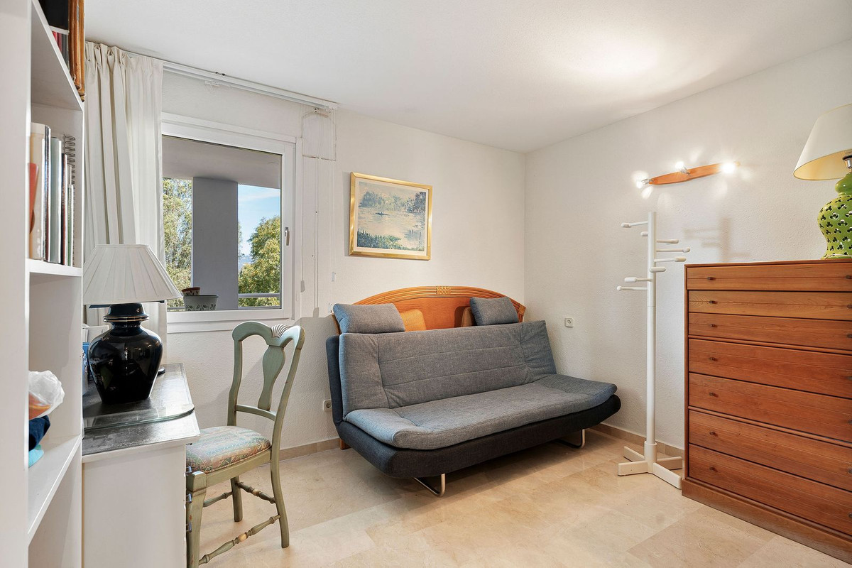Top floor apartment in the popular complex of Nordic Royal Club. Situated on the 5th floor gives the apartment beautiful views over the well kept garden towards the sea. There are 2 well sized bedrooms and 2 bathrooms. The lounge area and master room opens up towards the glassed in terrace. The urbanisation has a 24 hr reception ensuring good security and peace of mind. The apartment comes with an underground parking and storage room. From the parking there is access to the apartment floor by the elevator. Hot and cold water are included in the community fee.
