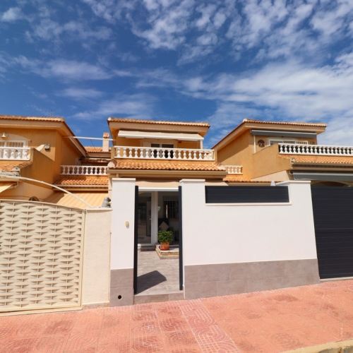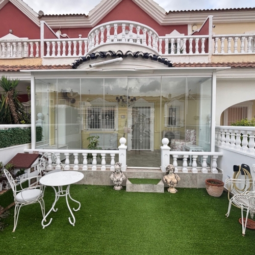 This East Facing, Three Bedroom, End Townhouse in Benijofar is located within a lovely, well-kept urbanisation, just a 5 to 10 minute walk from a wide range of amenities, including a park and lake, commercial centre, popular cafés, restaurants, and a main chain supermarket. La Marquesa golf course in Rojales is just a 10 minute drive and the all so popular Guardamar stretch of beach 15 minutes.  Spread over three floors and beautifully presented throughout, this spacious 174m² home features an open-plan living area with glazed doors leading out to a partly covered terrace, boasting views over the communal pool area. The modern fitted kitchen is sleek and functional, and there's also a convenient cloakroom on the main level. Stairs lead both to the first floor and down to the large underbuild garage. Upstairs, the first floor offers three double bedrooms, all with built-in wardrobes. Two of the bedrooms have access to private terraces one offering a view towards the mountains, and there are two stylish shower rooms, including one en suite to the master. Outside is a tiled, low-maintenance garden, and the 58m² garage is accessed via a secure gated entrance. Extras include air conditioning and access to a beautifully maintained communal pool. A fantastic opportunity for full-time living or a holiday home in a sought-after location on the Costa Blanca South.\n