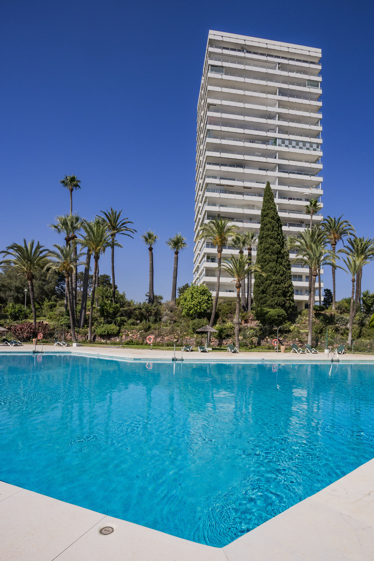 The building, where the property is sitting, is known for its height and prime location, offering 40,000 m² of communal gardens with fantastic amenities, including two swimming pools, tennis courts, paddle tennis courts, a barbecue area, and a children's playground.