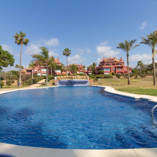 Beautiful flat located in the Pino Golf community in Elviria. Spacious ground floor flat facing west, overlooking the communal gardens and swimming pool.
