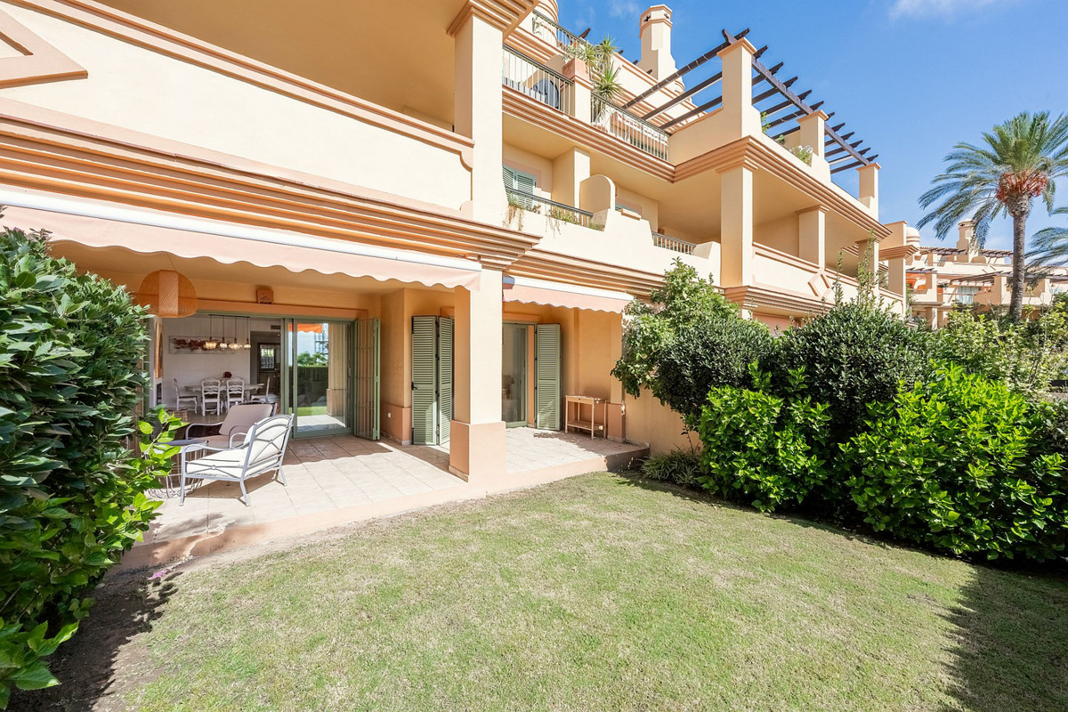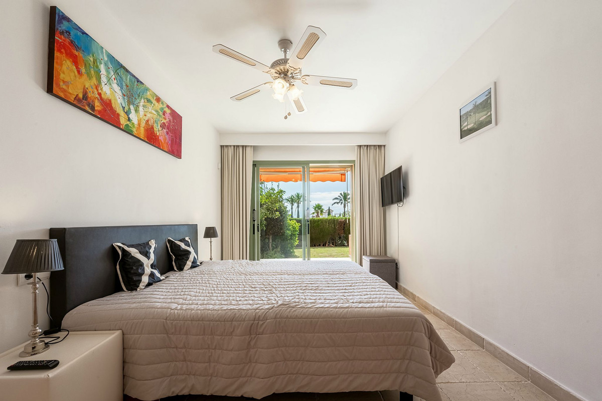 The property boasts a 50 m² private garden with direct access to the main pool, offering beautiful views of the sea and lush communal gardens. The gated community features 24-hour security, three swimming pools, and landscaped green areas, providing a safe and relaxing environment.