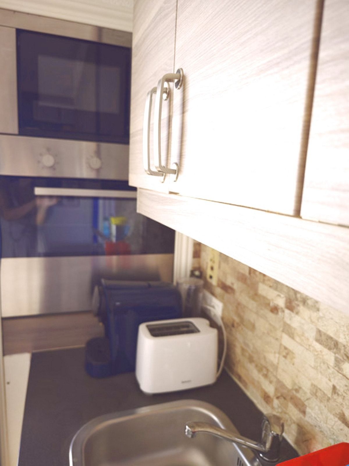 The space includes a cozy living room with an integrated kitchen and a convertible bed that discreetly hides inside the wardrobe to maximize the usable area.