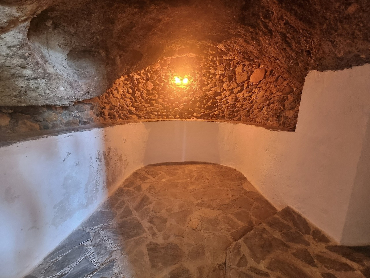 A graceful archway ushers you into a distinctive cave room, its walls adorned in natural stone. Beyond the lounge, a well-appointed guest bathroom offers convenience and comfort, while a corridor leads to a charming twin bedroom—perfect for guests or flexible as a study. At the end of this corridor lies a surprising amenity: direct access to a private garage—an unparalleled luxury in village living.