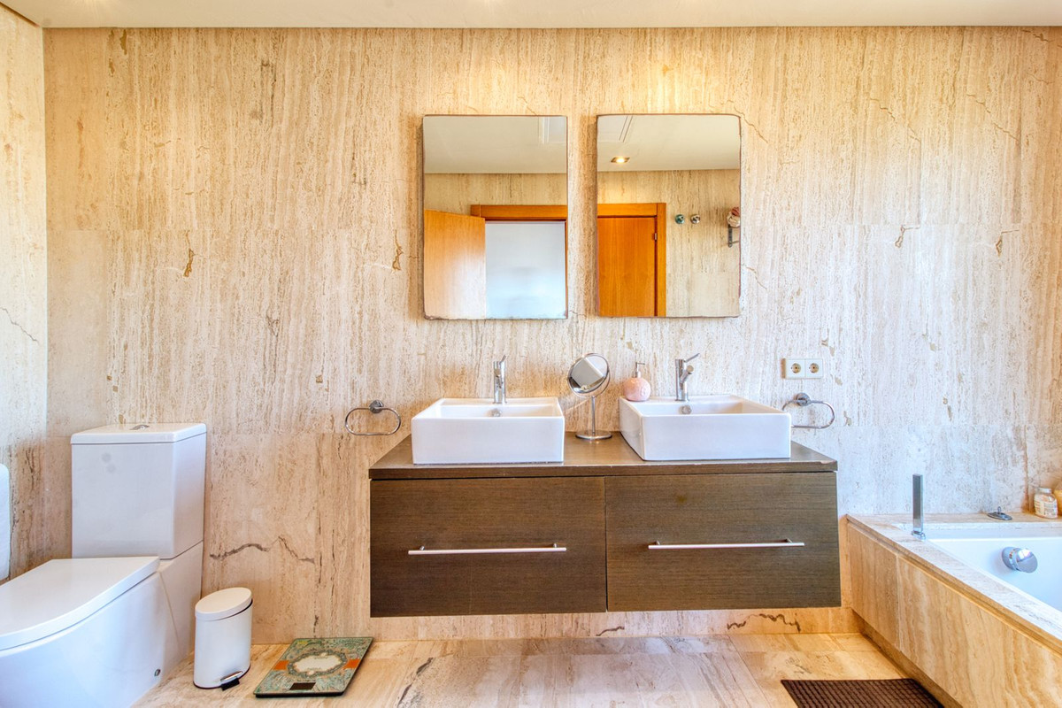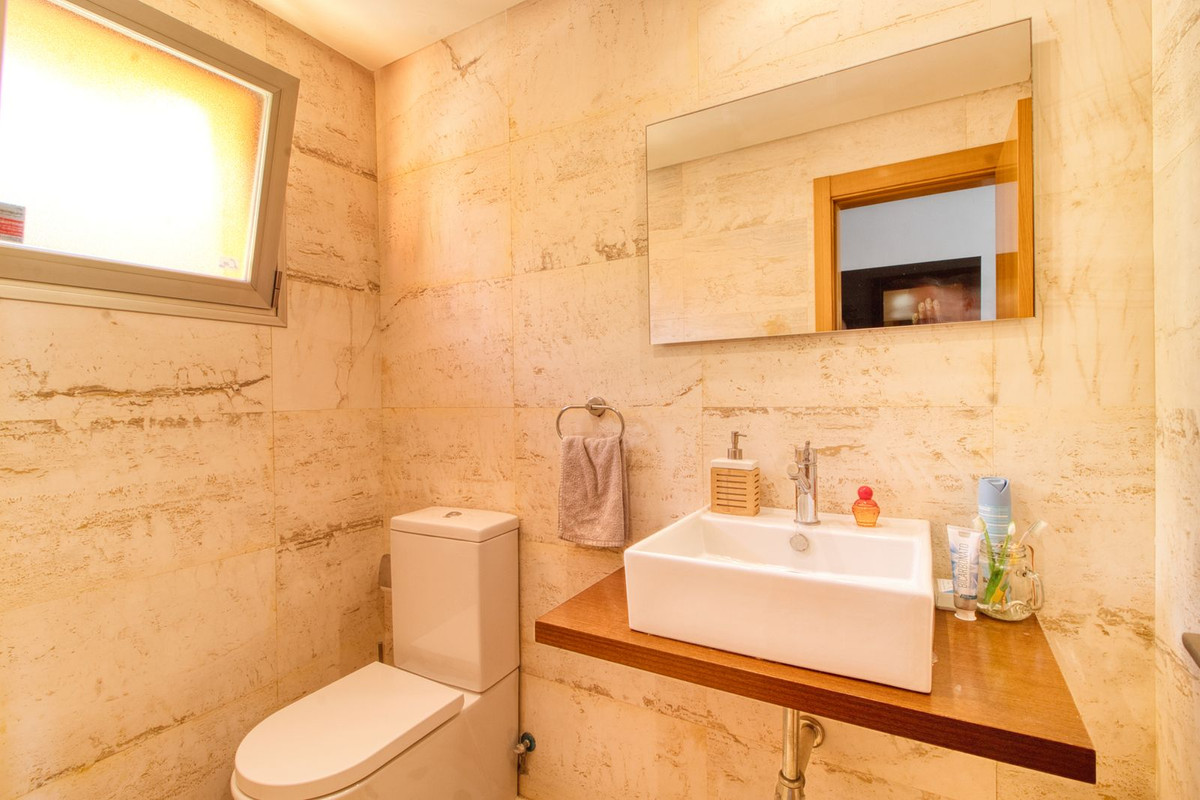 On the ground floor, you will find a bright living and dining area, a fully equipped kitchen, and a guest toilet. A large terrace extends from the living space, perfect for enjoying the Mediterranean breeze. The first floor features two generously sized bedrooms, each with its own ensuite bathroom and one with private balcony. The lower level adds versatility, currently used as a third bedroom, and also includes a separate laundry room for extra convenience.