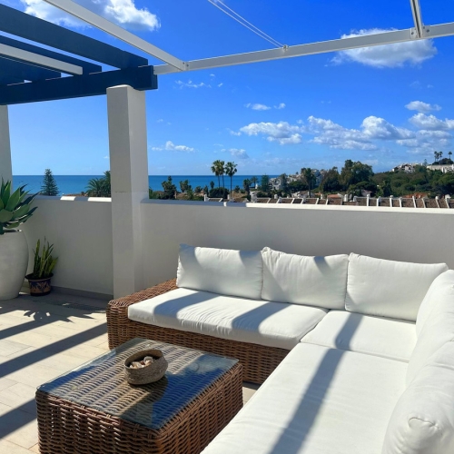 This spacious three-bedroom penthouse is located in Costalita in Estepona East. Upon entering, you are welcomed by a modern kitchen that flows into the dining area and living room, with direct access to the terrace. From the terrace, you can enjoy beautiful views of the swimming pool, which is part of the communal areas of the urbanisation.