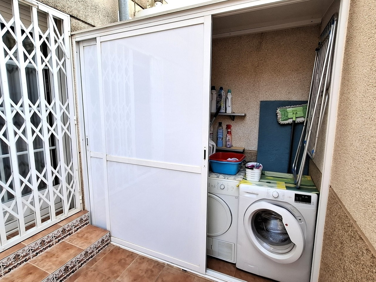 From the kitchen, access is provided to a rear terrace, with a weatherproof utility cupboard housing the washing machine, and additional storage.
