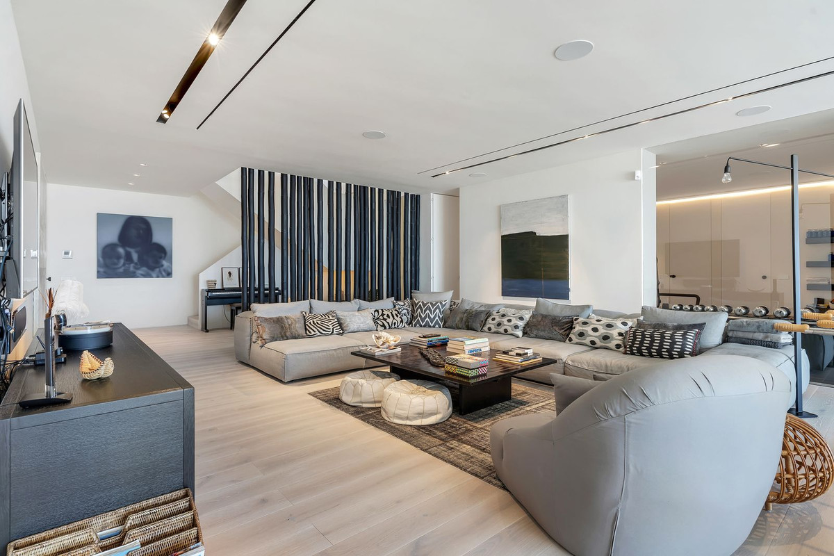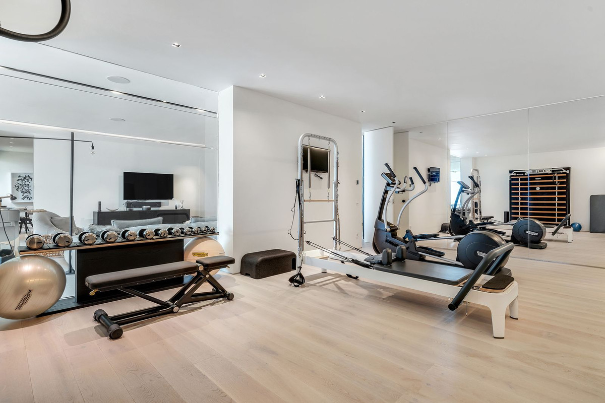 The lower level offers a large family lounge ideal for movie nights and games, along with a spacious gym, home office, and two additional bedrooms. Extending from this floor, a vast covered terrace opens onto a stunning dark infinity pool with a sunbathing area — the perfect spot to unwind in peace and take in the incomparable views.